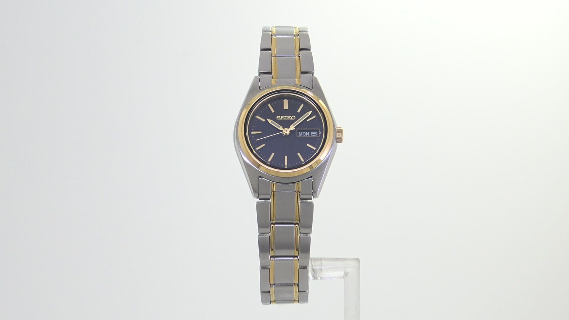 From the Essentials Collection. Offering classic dress/sport designs, the Essentials Collection provides the ideal solution for everyday wear. Crafted of stainless steel in versatile two-tone finish, this perfectly balanced watch features a blue sunray dial with day/date calendar and sleek gold stick markers for a superb blend of clarity and style. 10 bar, 100M Water Resistant