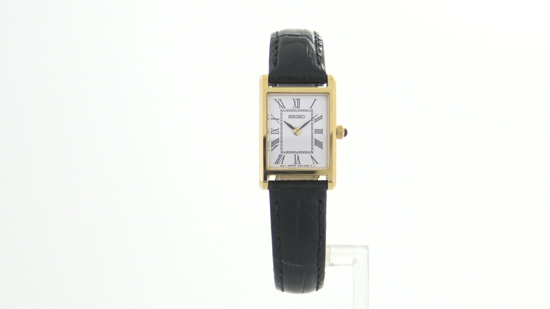 From the Essentials Collection. Offering classic designs, the Essentials Collection provides the ideal solution for everyday wear. Crafted of stainless steel in gold-tone finish, this elegant watch, with sophisticated rectangular case, features a traditional white dial with Roman numerals and finely shaped hands, cabochon crown and black leather strap for perfect day-to-evening style. 3 bar, 30M Water Resistant