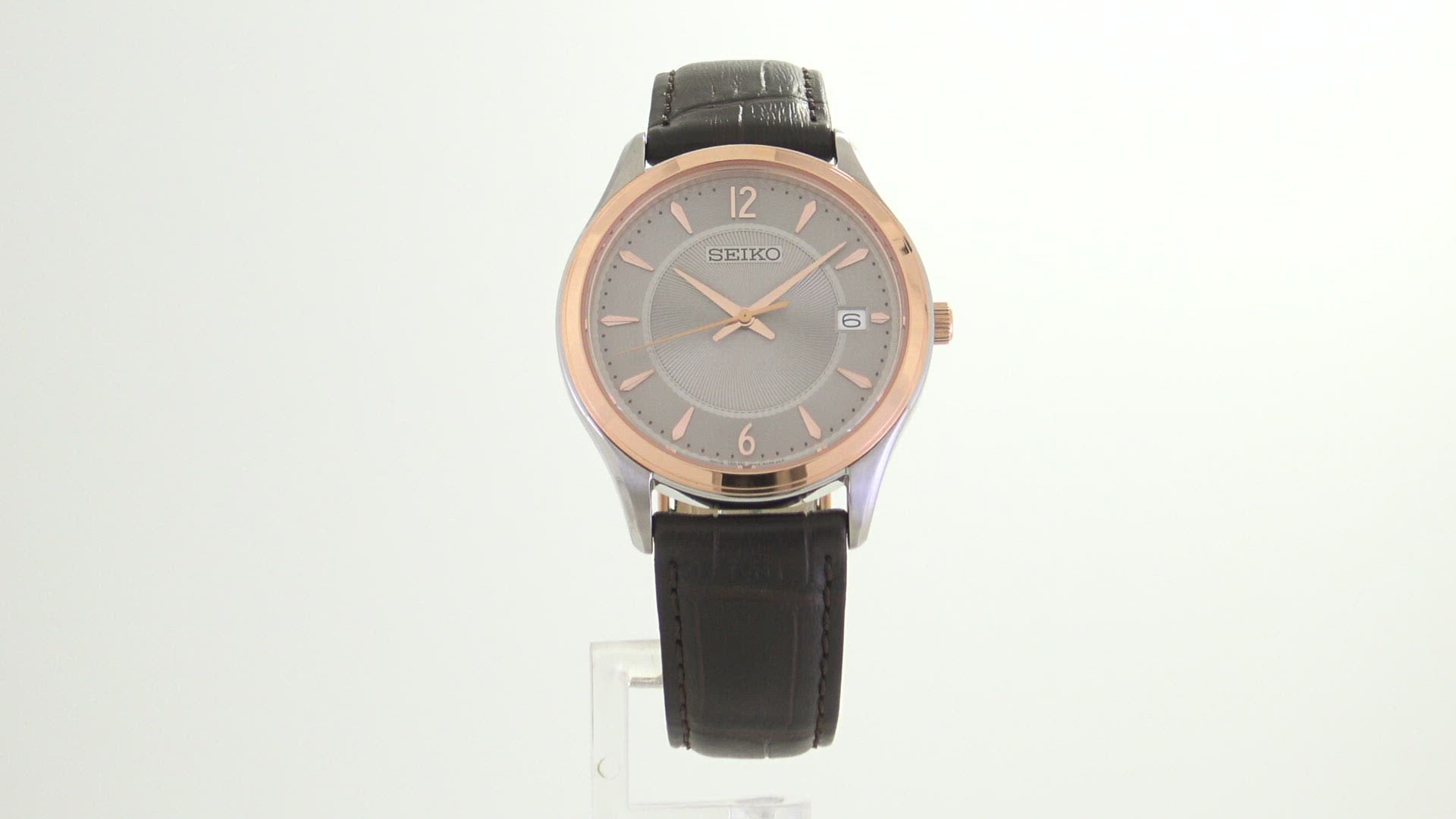 From the Essentials Collection. Offering classic dress/sport designs, the Essentials Collection provides the ideal solution for everyday wear. Crafted of stainless steel in two-tone rose gold finish, this perfectly tailored watch features a patterned silver dial with date calendar, as well as rose gold Arabic numerals and stick markers, for a superb blend of clarity and style. With brown leather strap and a sapphire crystal for superior scratch resistance. 10 bar, 100M Water Resistant