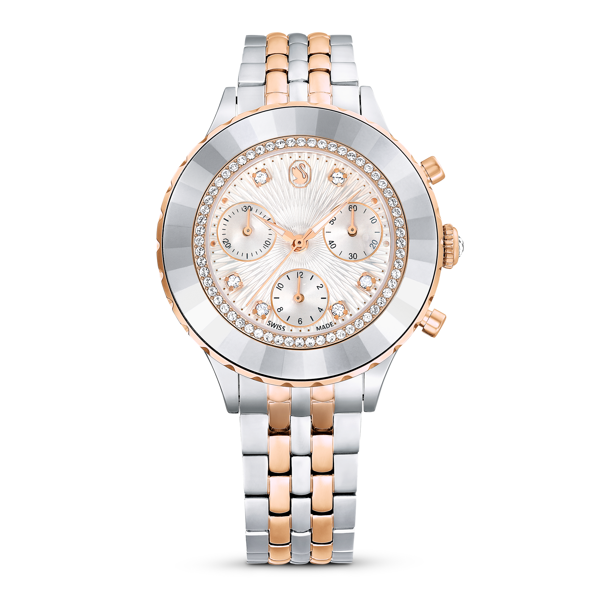 This dazzling chronograph watch delivers a perfect fusion of watchmaking expertise and Swarovski savoir-faire. The 37mm design is made with a mix of stainless steel and rose gold-tone finishing, and features a crystallized bezel, which is neatly faceted and accompanied by a circle of clear pavé. Beneath the mineral glass, the white guilloché dial features a swan logo at 12 o’clock, LumiNova coated hands, and three chronograph counters for separate measurements of hours, minutes, and seconds. There are also six clear crystals used for the indexes and a single crystal placed in the watch’s crown. This Swiss made watch is water resistant to 50m and is worn on a quick release bicolor bracelet.