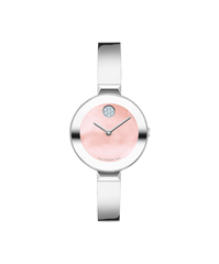 The BOLD Bangle is defined by an elevated, bold case and an intergrated jewelry-inspired bracelet. This 28mm watch features a pink sunray dial with a mother-of-pearl overlay, slim steel hands, and a crystal pavé dot at 12 o'clock. Mother-of-Pearl dials may vary in color as each piece is unique making every watch one of a kind.