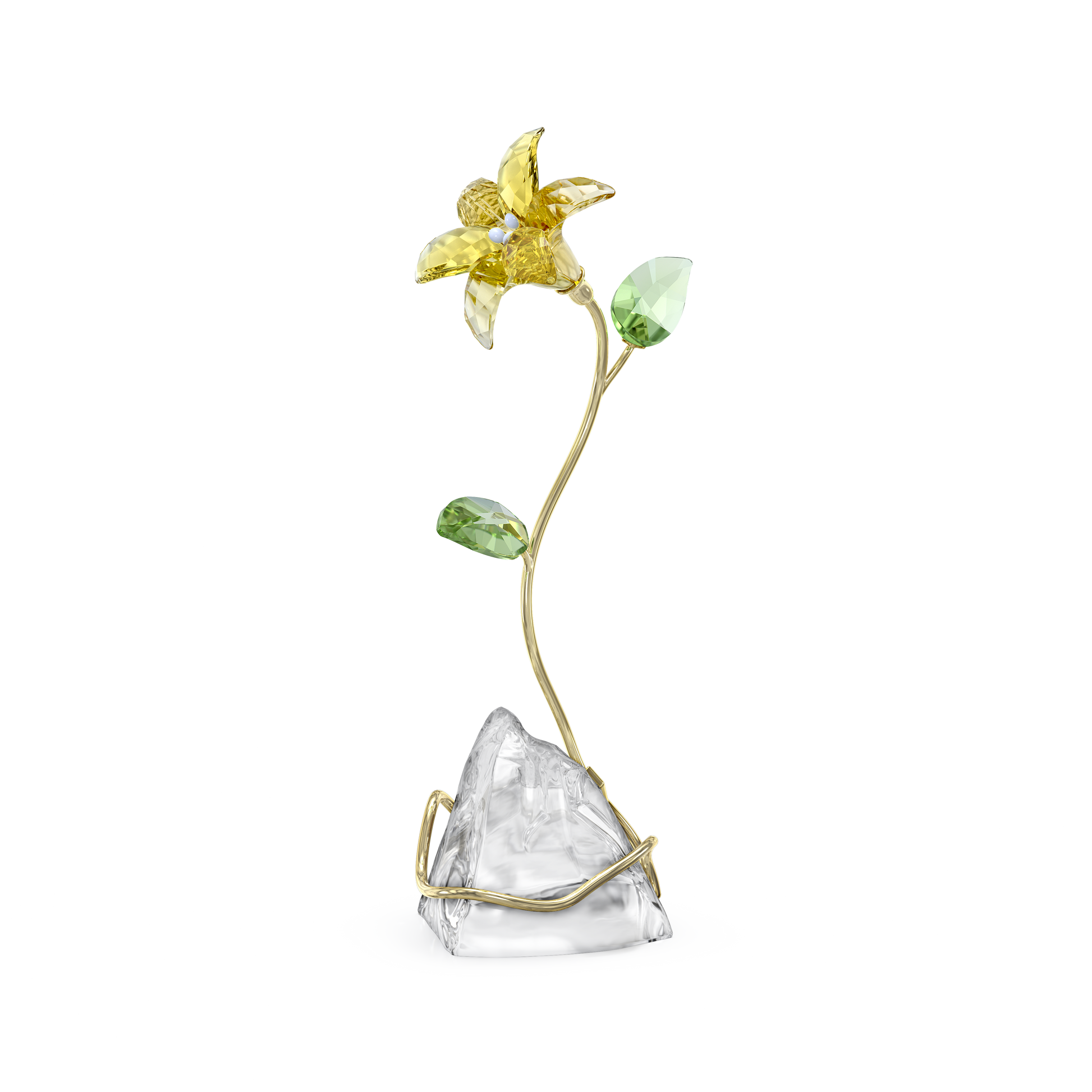This radiant lily perfectly encapsulates Swarovski’s savoir-faire. Produced with 222 light-catching facets, the yellow flower is accompanied by green crystallized leaves, all set on a gold-tone metal stem that gracefully entwines across a natural unfaceted crystal base. Representing purity and innocence, this freestanding design would make a truly elegant addition to any home décor. No vase or base required. Decoration object. Not a toy. Not suitable for children under 15.