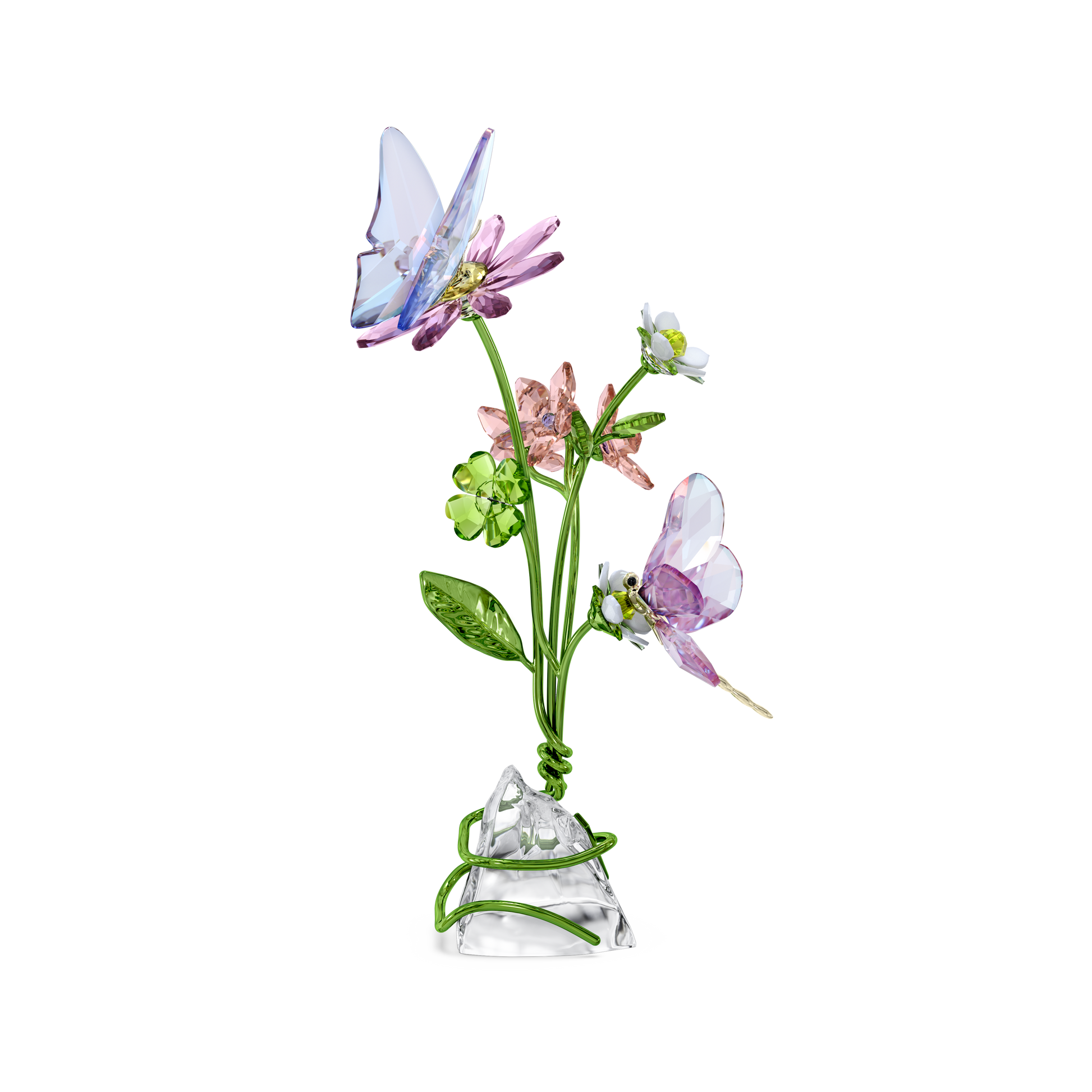 In this idyllic wildflower scene, Swarovski has captured the beauty of nature in exquisite detail. The crystallized creation is produced in a variety of vivid colors, with 1,229 facets that reflect light from every angle. Along with a delicate butterfly and curious dragonfly adorned with precision-cut wings, this joyful piece features lacquered metal accents, forming luminous leaves and stems that gracefully entwine across a natural unfaceted crystal base. An imaginative display that will inject pure wonder into any home décor. No vase or base required. Decoration object. Not a toy. Not suitable for children under 15.