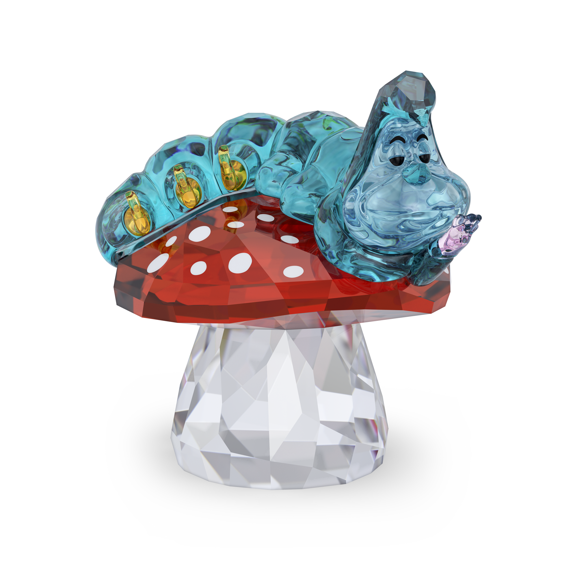 Symbolizing freedom and transformation, the blue caterpillar from Alice in Wonderland taught Alice how to shrink and grow. In this dazzling figurine, the caterpillar sits atop a magical mushroom, waiting for the next adventurer to cross its path. The expertly crafted design features 229 facets and is brought to life through a multitude of colors, including blue and red. Bring this Disney figurine home to enhance your own décor with curiosity and joy. Decoration object. Not a toy. Not suitable for children under 15.