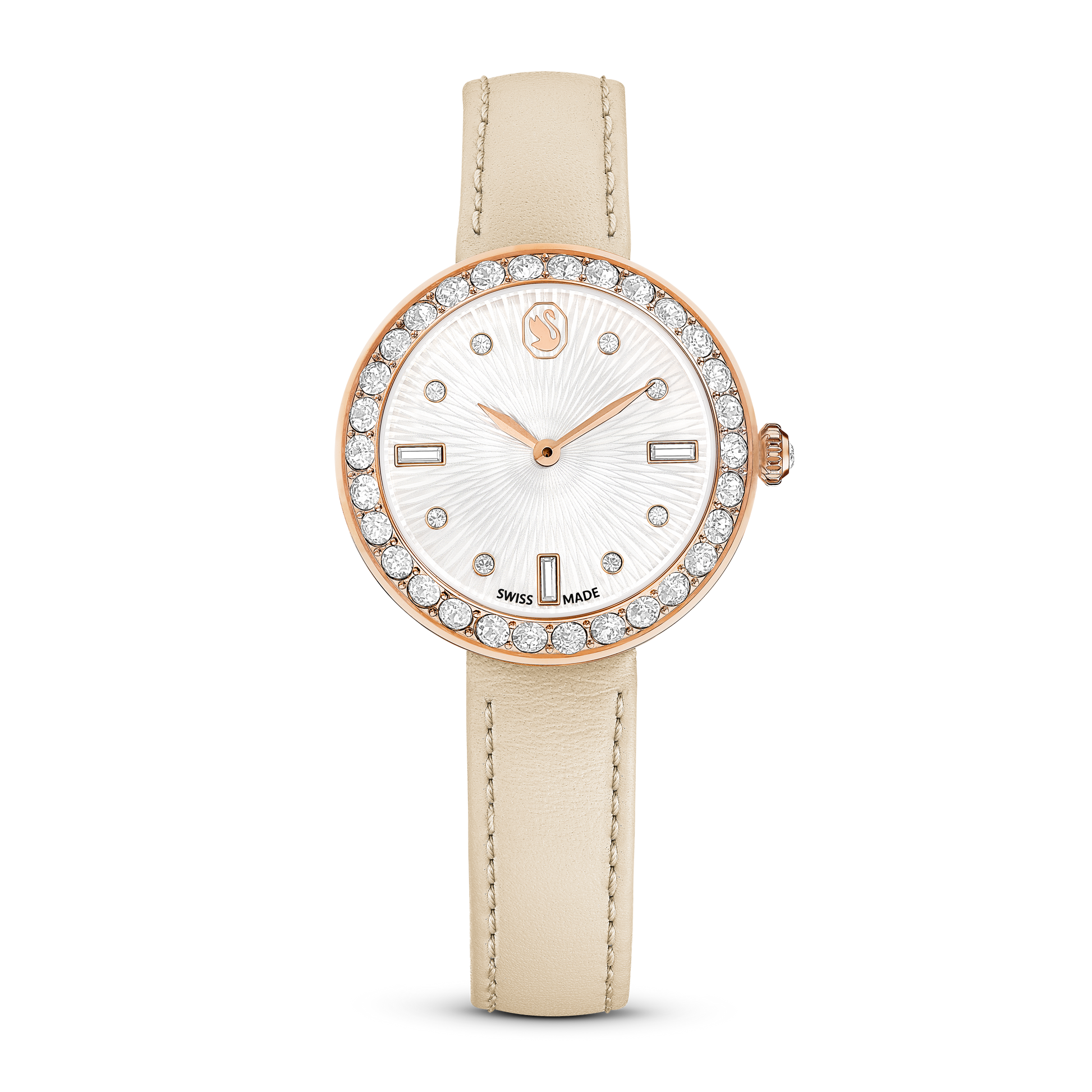 This Certa watch delivers a sublime fusion of artistry and performance. The round 30mm case is made with a beautiful rose gold-tone finish and features a bezel set with a pavé of 30 crystals. Beneath the mineral glass, a mesmerizing guilloché dial is revealed, with the Swarovski swan logo at 12 o’clock, along with indexes created from round and baguette crystals. There is also a single crystal set in the watch’s crown. For style around the wrist, the watch is presented on a quick-release Italian calfskin leather strap in beige with refined stitching. This Swiss made watch is water resistant to 50m and is designed to keep you on time for everyday occasions with exquisite sophistication.
