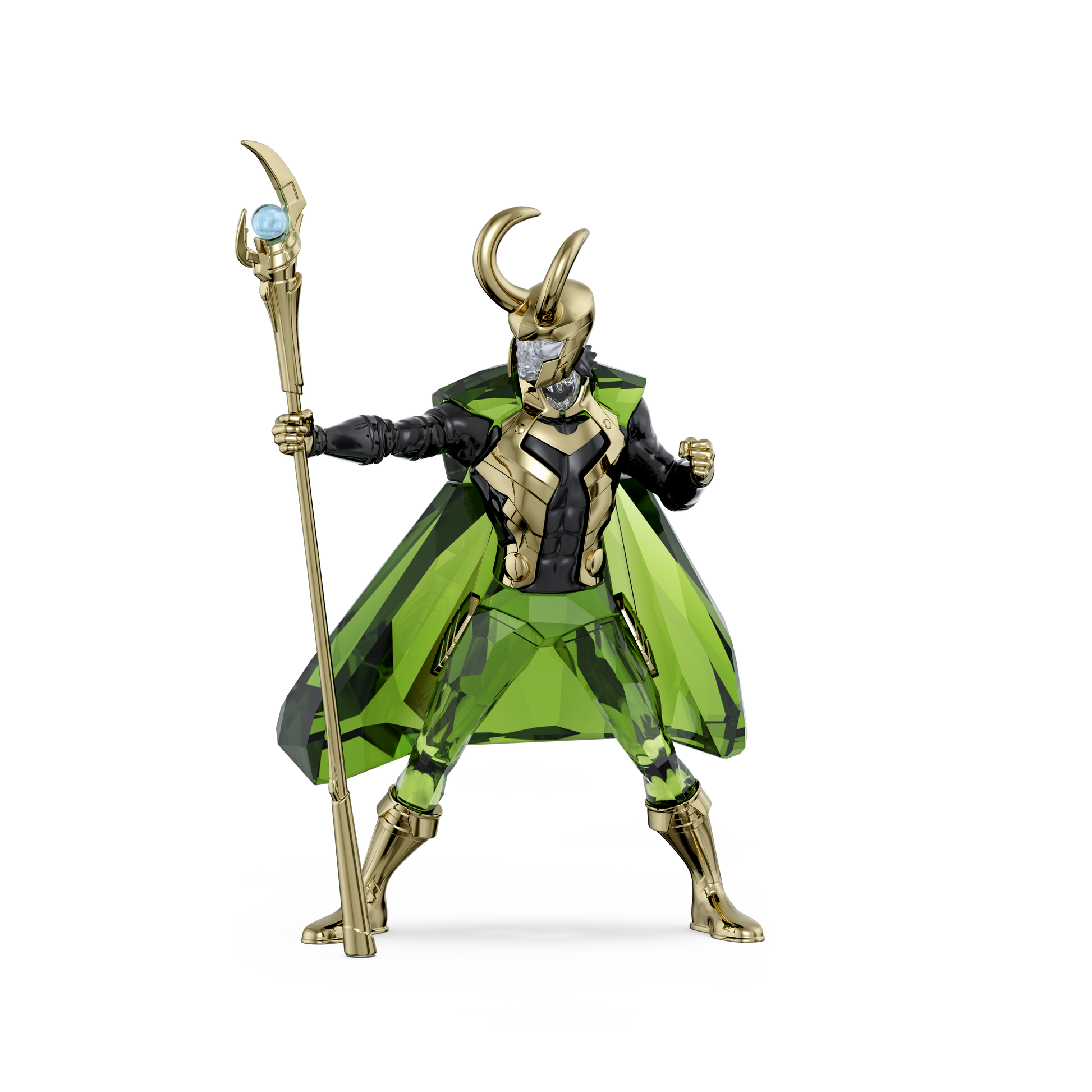 Crafted in a luminous shade of green, there’s no mistaking Loki, the power-hungry God of Mischief. To honor Thor’s ultimate foil, Swarovski has crafted this crystallized figurine with 282 facets, along with touches of gold-tone lacquered metal forming his chest armor, scepter, horned helmet, and boots. The result is a collectible piece that perfectly represents Swarovski’s extraordinary technical skill and mastery of cutting. Decoration object. Not a toy. Not suitable for children under 15.