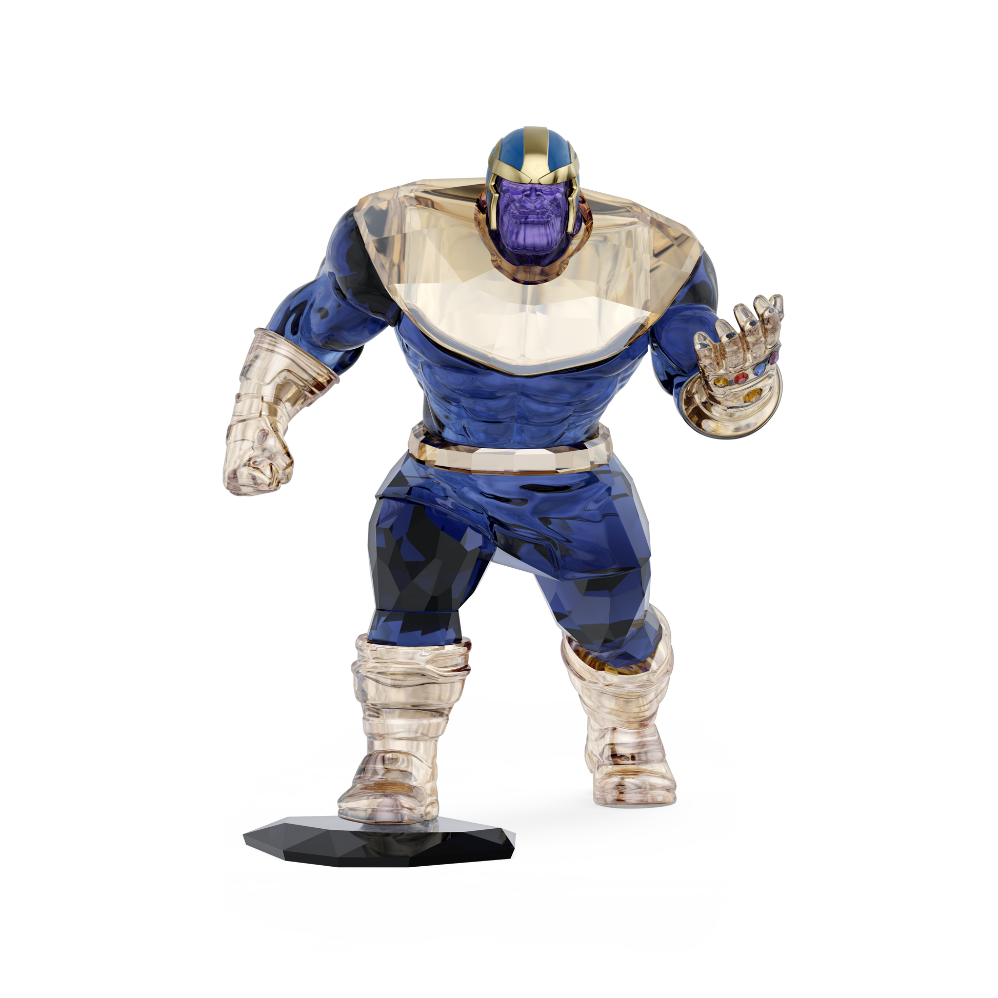 This bold and imposing figurine is a powerful tribute to the villainous titan, Thanos. Crafted with metal accents and 607 crystallized facets, Swarovski has utilized all of its master cutting expertise to precisely carve the features of this tall and muscular character. This includes the complete set of infinity stones on his hand gauntlet, which symbolizes Thanos’ ominous quest to dominate the universe. Own this collectible figurine and embrace infinite power. Decoration object. Not a toy. Not suitable for children under 15.