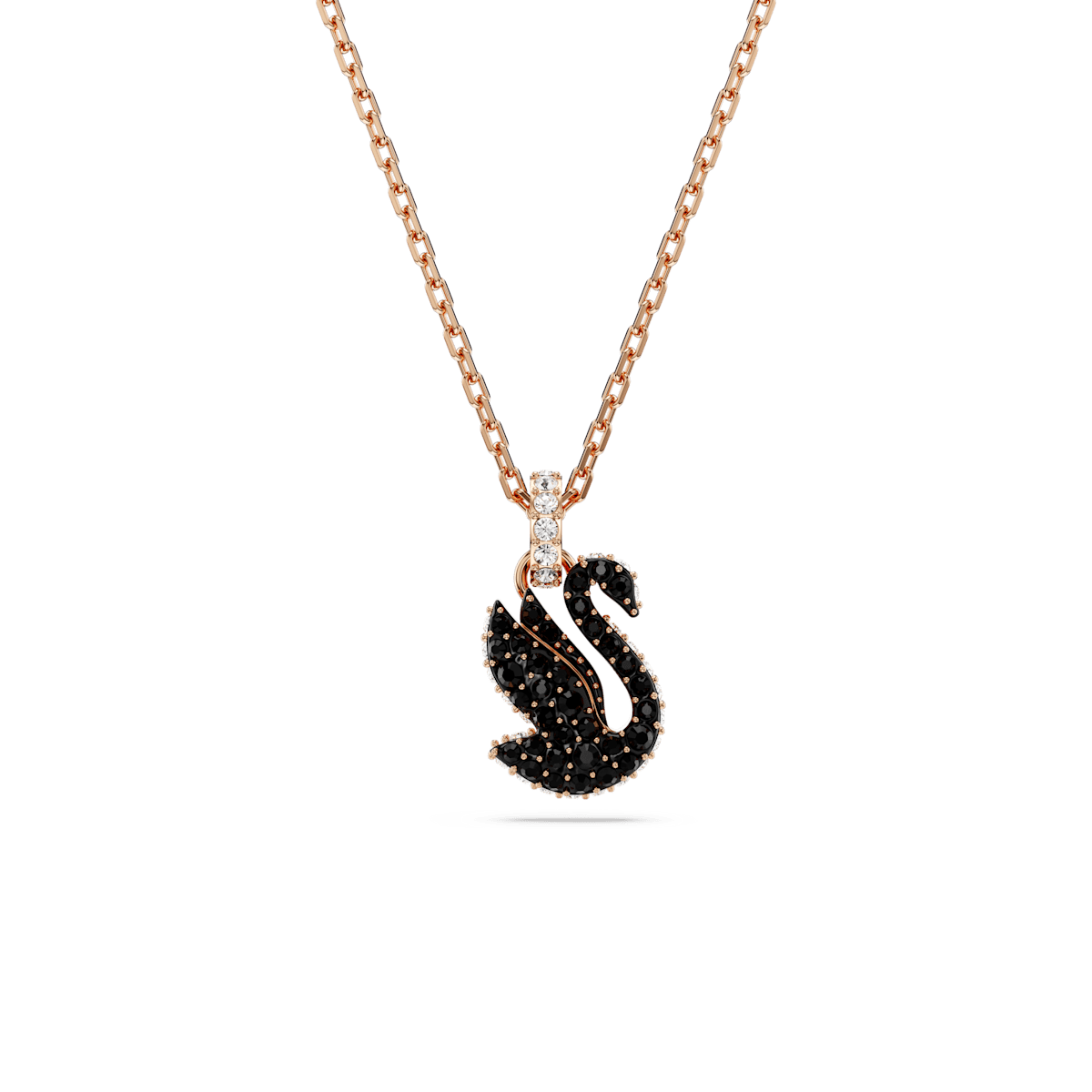 With its captivating intense tones, this refined pendant is inspired by the signature emblem of Swarovski. The design is worn on a rose gold-tone plated chain and features a swan motif, expertly decorated with a pavé of jet black Swarovski ReCreated™ crystals. Wear this alluring piece to add instant sophistication to your style.