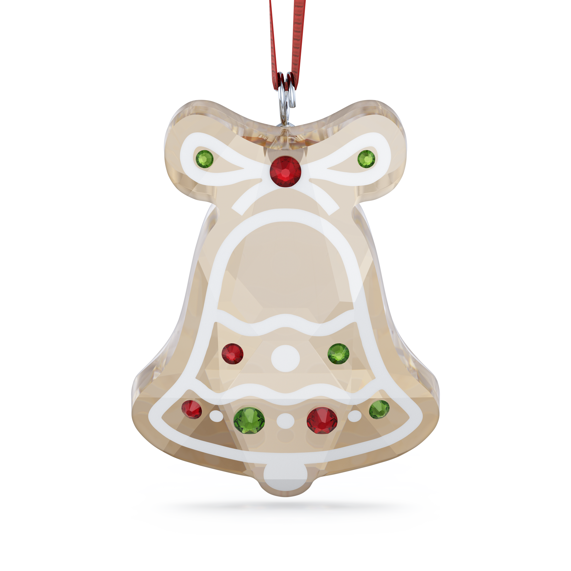 Crafted in a cookie-cut style, this delightful gingerbread ornament exudes charm. Shaped like a festive bell, the piece has a golden glow with 182 light-catching facets. Additional flatbacks and printed frosting elevate the design’s refinement and radiance while evoking tradition. An ideal gift, the piece is suspended from a red grosgrain ribbon and is a joyful celebration of one of the season’s favorite sweet treats. Decoration object. Not a toy. Not suitable for children under 15.