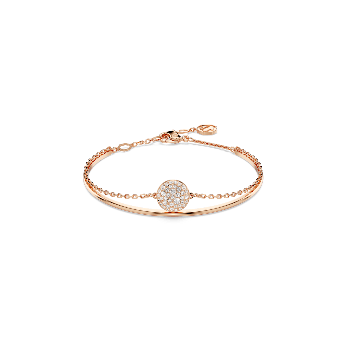 In tribute to the cosmos, this starry bangle is filled with light-catching joy. Around the wrist, the rose gold-tone plated design features a rigid band alongside a delicate chain with a domed meteor motif. This has been beautifully adorned with a snow pavé of clear round crystals in different sizes. Pair this bangle with a matching pendant to elevate any outfit.