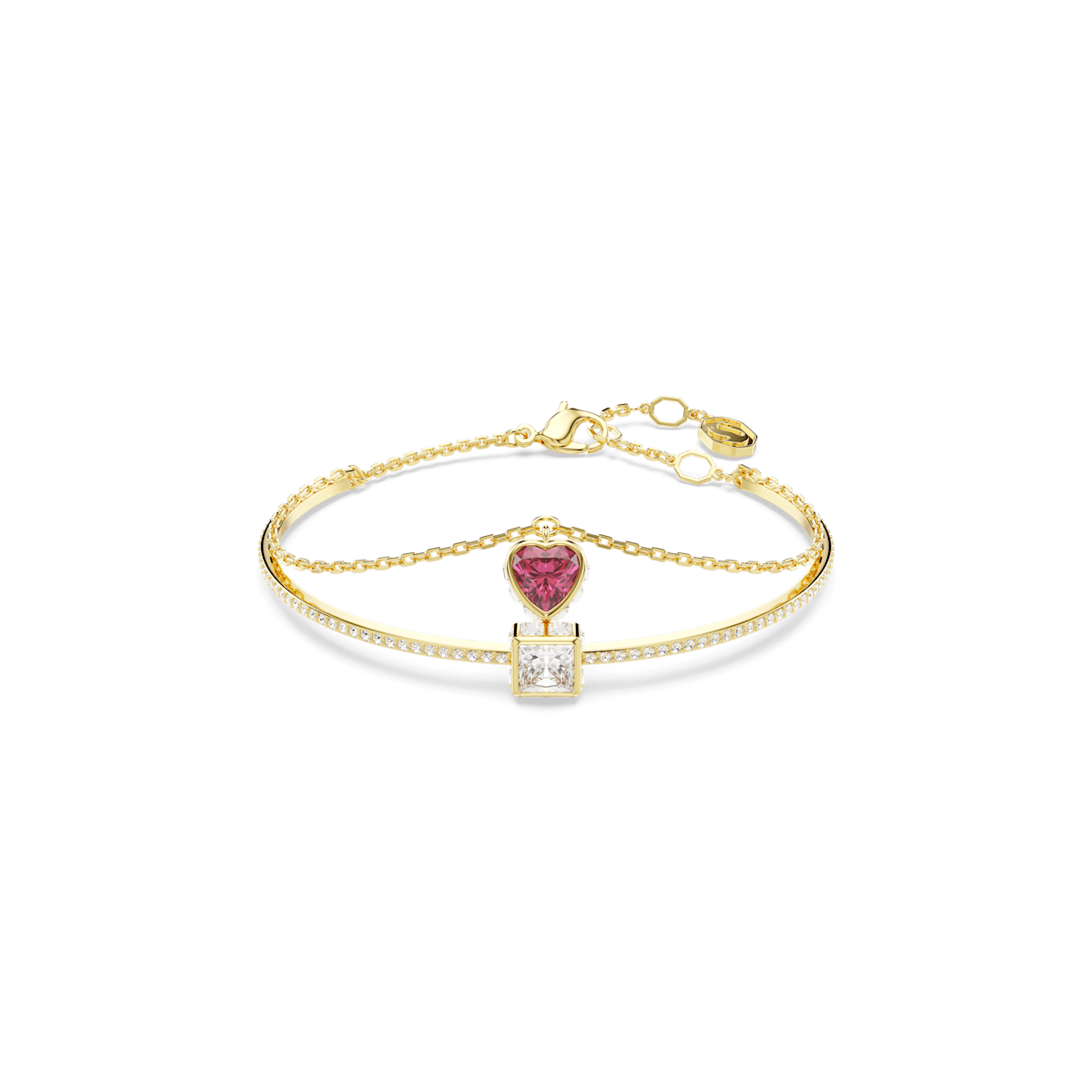 This captivating double bracelet is made with romance in mind. The gold-tone plated design features a rigid band with clear pavé and a square center stone in clear Swarovski Zirconia, while the chain is adorned with a heart-shaped center stone, which is made from red Swarovski Zirconia and enhanced with clear square crystals around the edges. Completed with a lobster closure, this bracelet is the perfect gift for someone you adore.