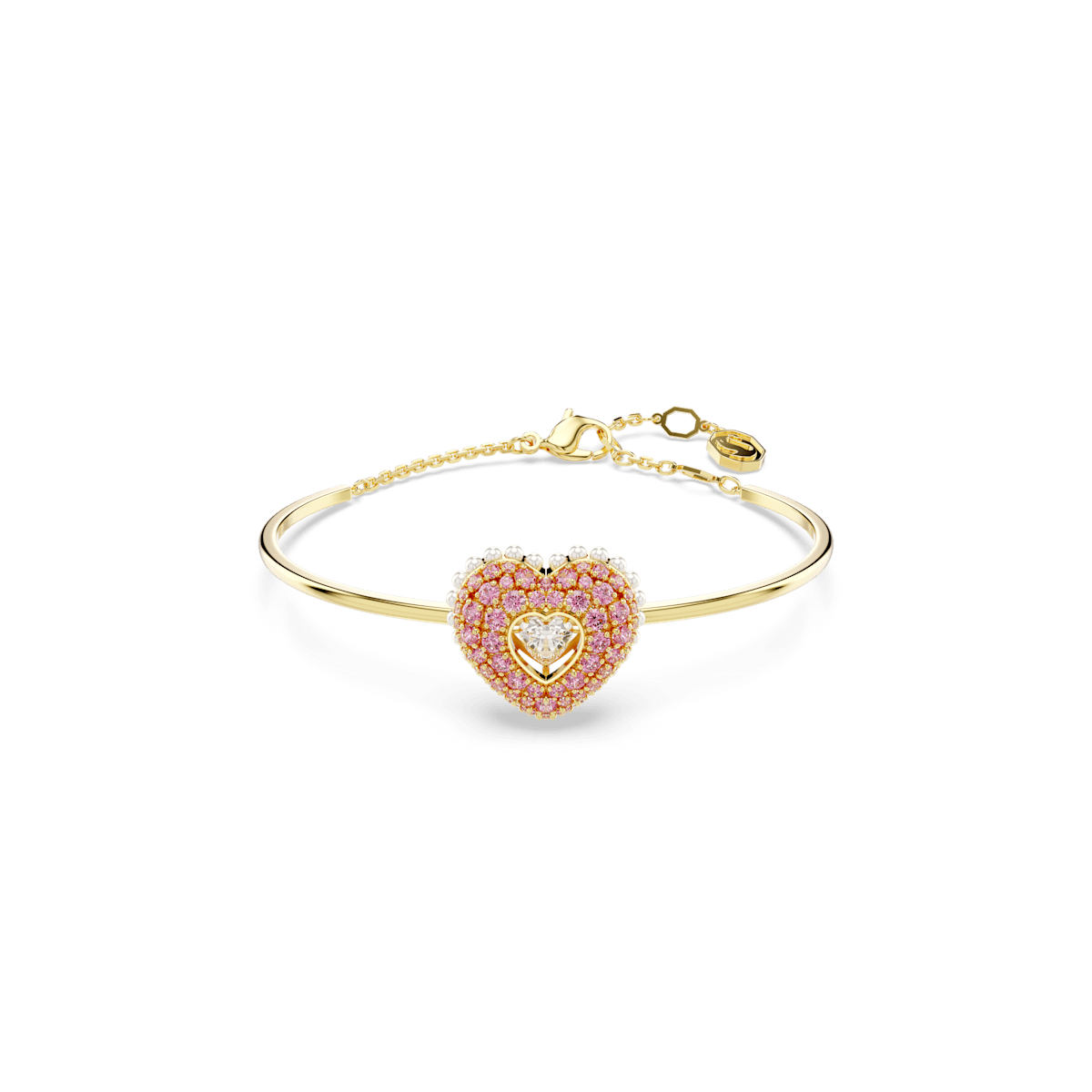 This gold-tone Hyperbola bangle expresses love through a combination of colors and cuts. The heart-shaped motif has been created with a cage design for maximum volume and includes an array of tiny white Crystal Pearls around the edging. To enhance the domed effect, it is adorned with round pink Swarovski Zirconia, set in place using the dazzling chatonnage technique. At the center, a heart-shaped dancing stone catches the light from every angle. Gift this as a special surprise to someone you adore.