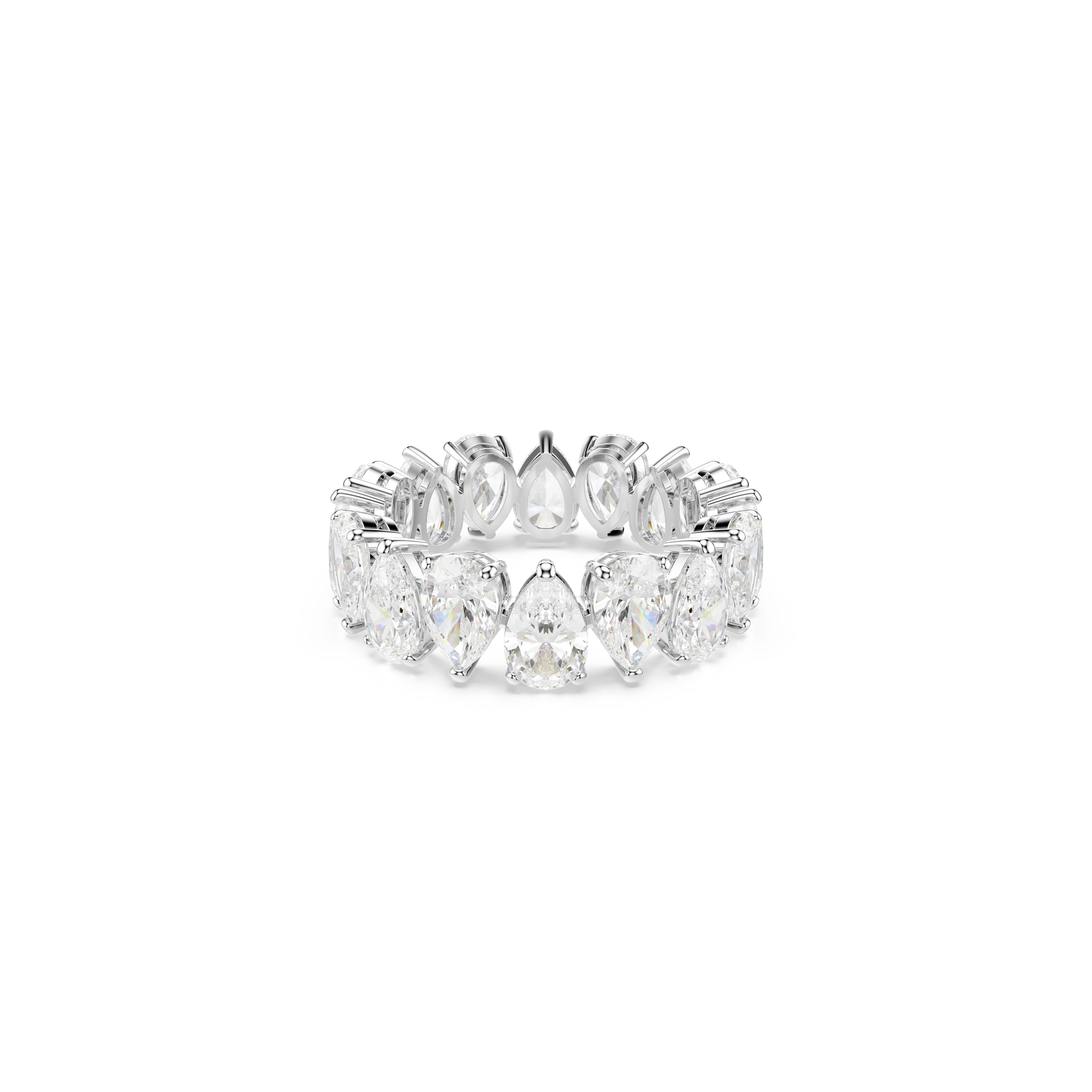 This ring by Swarovski showcases the sparkling beauty of gleaming, faceted stones. White, drop-shaped elements arrayed in a single row beautifully reflect and refract incoming light. Its puristic, elegant forms make this ring perfect for combination with other pieces of jewelry and trendy stacking looks with matching rings. An excellent choice to enhance an outfit for special occasions, and a truly inspired gift giving idea.