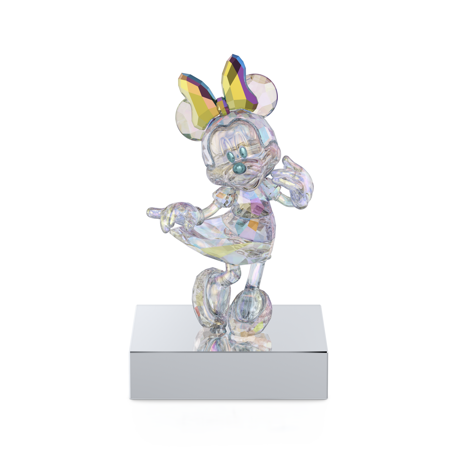 This luminous Minnie Mouse-inspired figurine is a mesmerizing example of Swarovski savoir-faire. Showing Minnie in a dynamic pose cut with 638 facets, it has a reflective platinum sheen created with an all-over coating of our signature Aurora Borealis effect for increased shimmer and intensity. Featuring a metallic base with a chrome finish and black velvet bottom, the figurine can also be removed from the base and placed anywhere in your home. A playful piece that beautifully celebrates one of the world’s most beloved animated characters. Decoration object. Not a toy. Not suitable for children under 15.