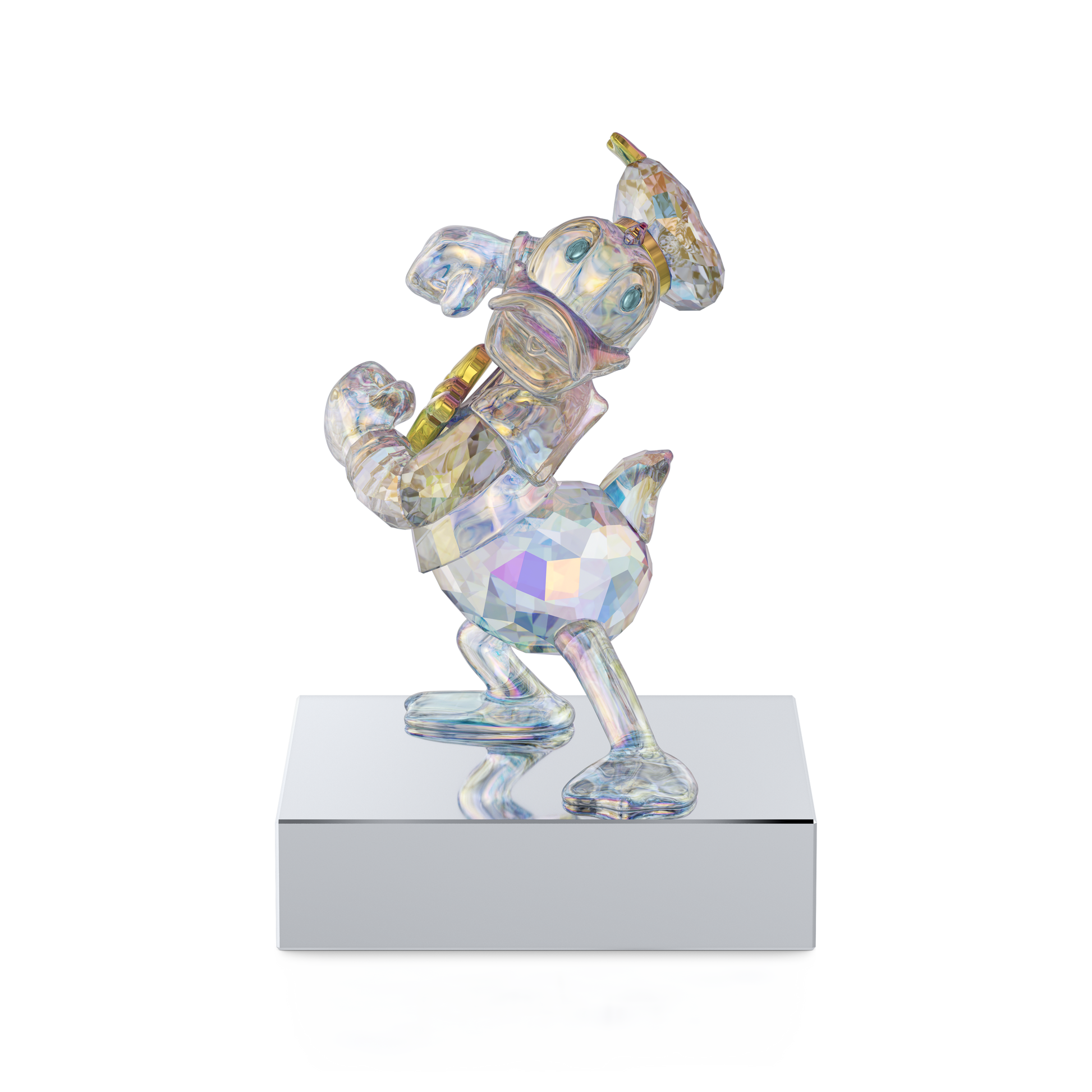 This radiant Donald Duck-inspired figurine is a mesmerizing example of Swarovski savoir-faire. Showing Donald in a dynamic pose cut with 609 facets, it has a reflective platinum sheen created with an all-over coating of our signature Aurora Borealis effect for increased shimmer and intensity. Featuring a metallic base with a chrome finish and black velvet bottom, the figurine can also be removed from the base and placed anywhere in your home. A playful piece that beautifully celebrates one of the world’s most beloved animated characters. Decoration object. Not a toy. Not suitable for children under 15.