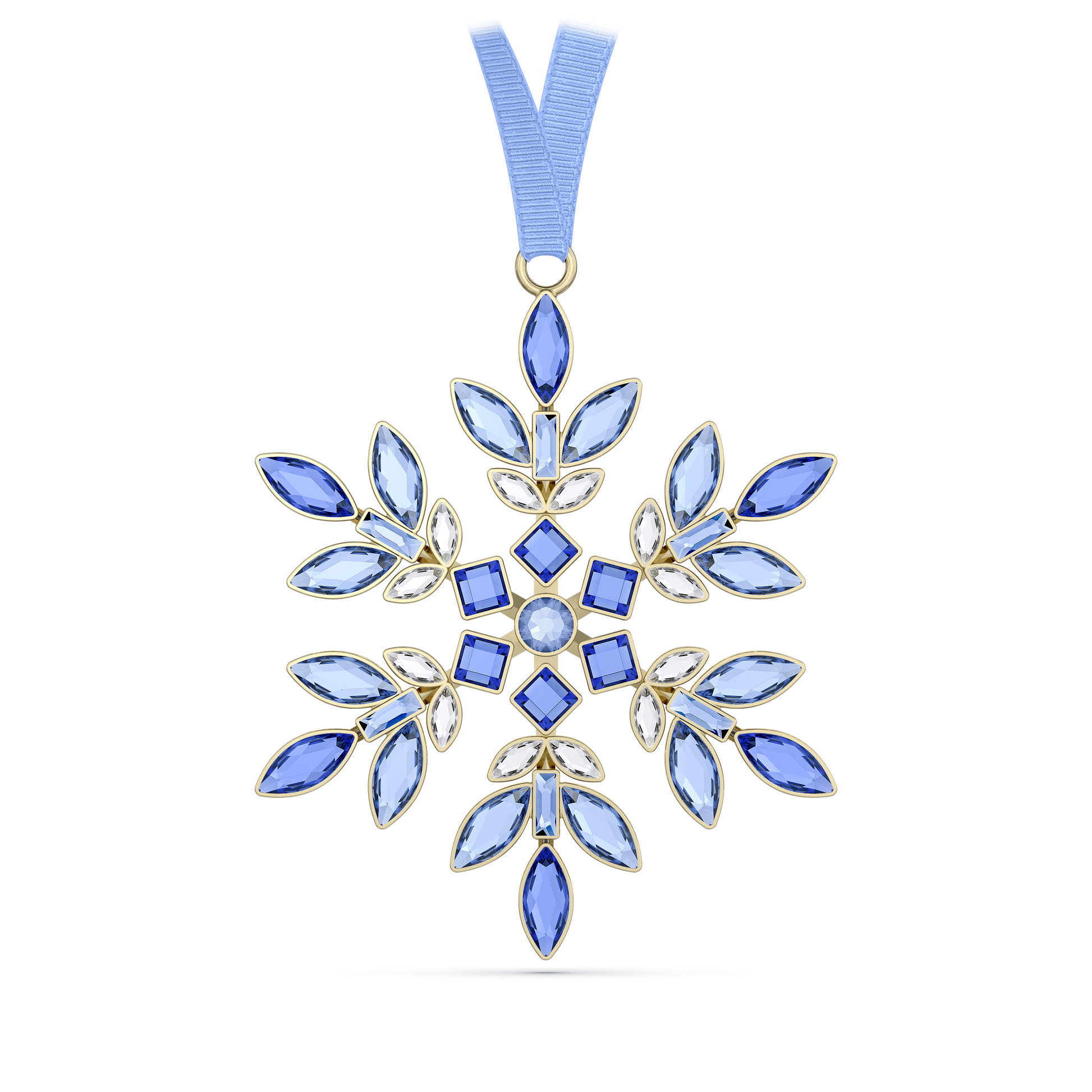 Inspired by the vibrant Gema family, this collection of radiant snowflake ornaments is presented in Swarovski brand colors with a nod to the holiday season. This blue piece is formed from 86 individual crystals in a variety of cuts and shades, applied on both sides using jewelry stone setting techniques. The design is suspended from a blue grosgrain ribbon and is completed with a glossy gold-tone finish. Collect all four of the Gema snowflake ornaments to create a joyful multicolored display in your home. Decoration object. Not a toy. Not suitable for children under 15.