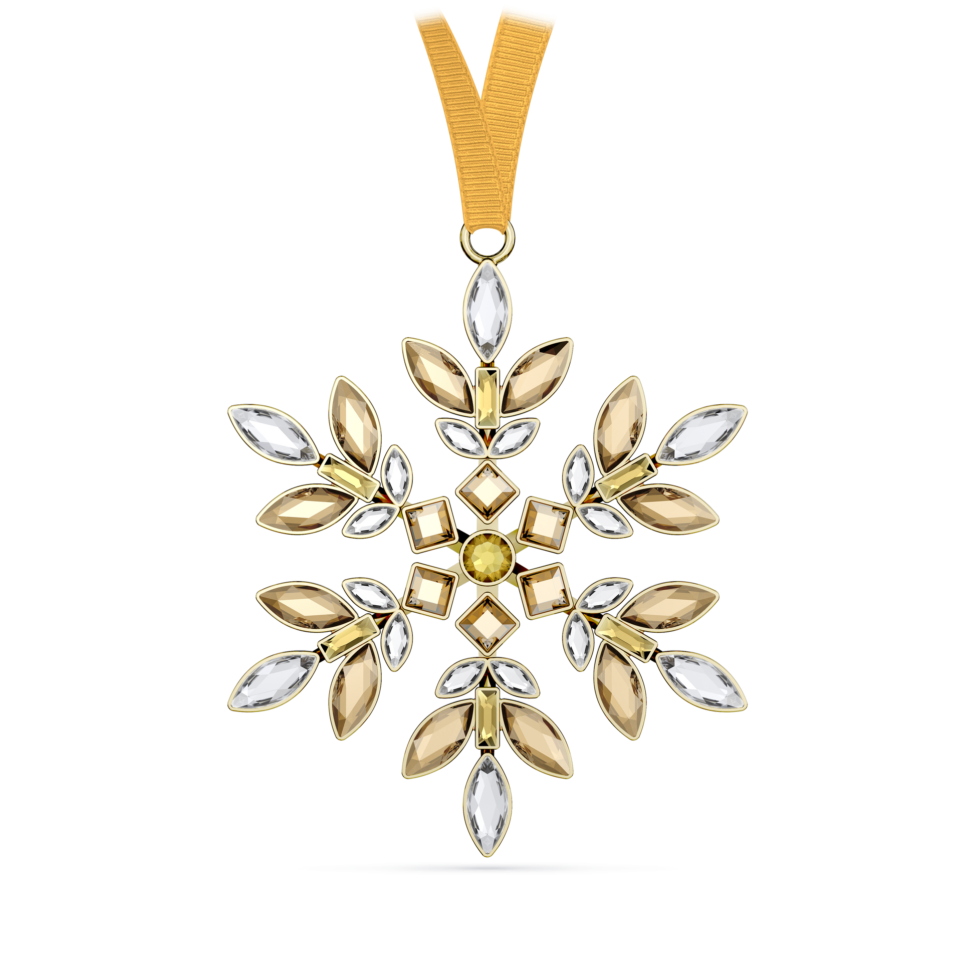 Inspired by the vibrant Gema family, this collection of radiant snowflake ornaments is presented in Swarovski brand colors with a nod to the holiday season. This yellow piece is formed from 86 individual crystals in a variety of cuts and shades, applied on both sides using jewelry stone setting techniques. The design is suspended from a yellow grosgrain ribbon and is completed with a glossy gold-tone finish. Collect all four of the Gema snowflake ornaments to create a joyful multicolored display in your home. Decoration object. Not a toy. Not suitable for children under 15.