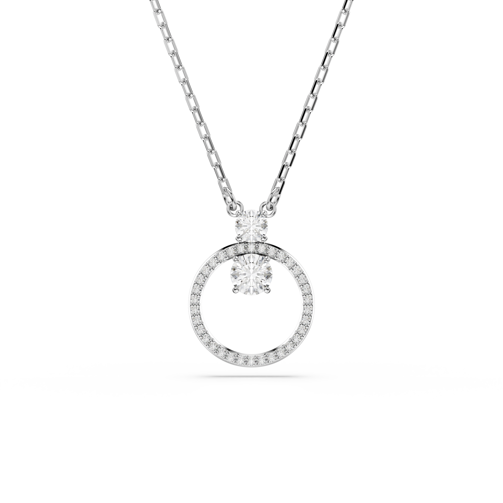 A modern take on the classic circle pendant, this rhodium plated piece features a central pavé ring of clear Swarovski Zirconia, with two larger prong-set Swarovski Zirconia holding it in place. A striking example of creative elegance, this pendant can shine solo or spark intrigue when paired with matching Constella earrings.