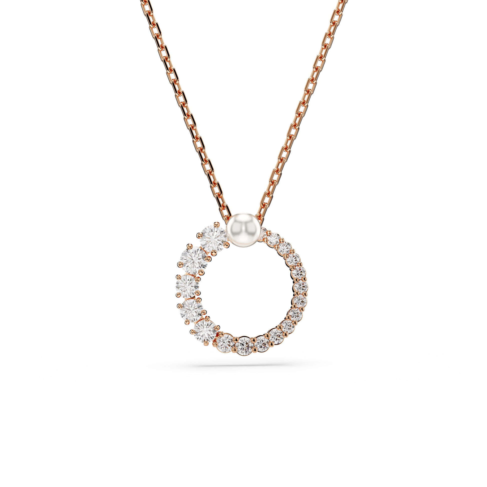 With its refined silhouette and modern detailing, this elegant Matrix pendant attracts attention. Suspended from a delicate chain, the rose gold-tone jewelry features a ring of clear Swarovski Zirconia, in sizes ranging from small to large, and bookended with a white Swarovski Crystal Pearl at the center. Style with a monochrome outfit for maximum effect.