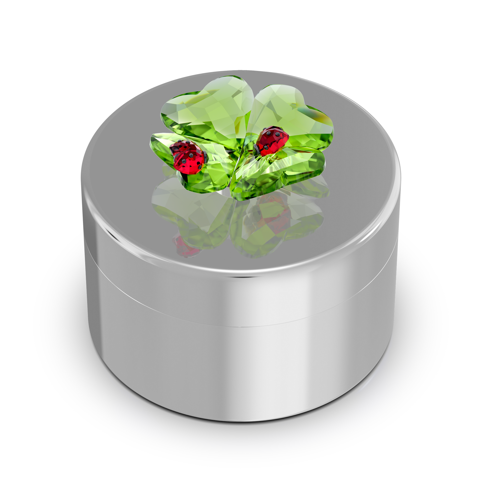 Ideal for storing your treasures, this glossy steel box is playfully adorned with a clover and ladybug display. The nature-inspired motif is crafted with 206 facets, and combines green and red tones that beautifully catch the eye. Inside, the box includes a velvet pouch, to always keep the contents safe and protected. Decoration object. Not a toy. Not suitable for children under 15.