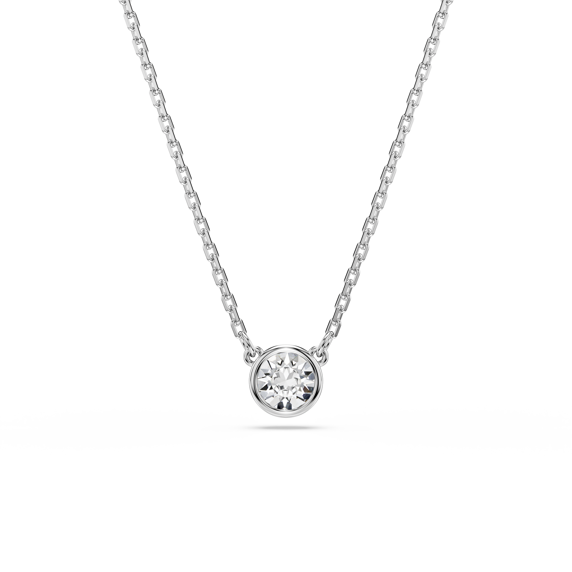 Effortless elegance is within reach thanks to this radiant Imber pendant. Suspended from a delicate chain with a lobster closure, the rhodium plated design features a central round-cut crystal in a puffy bezel setting. A single Swarovski Zirconia is also placed in the elongation for added radiance. Wear this piece to elevate your everyday style.