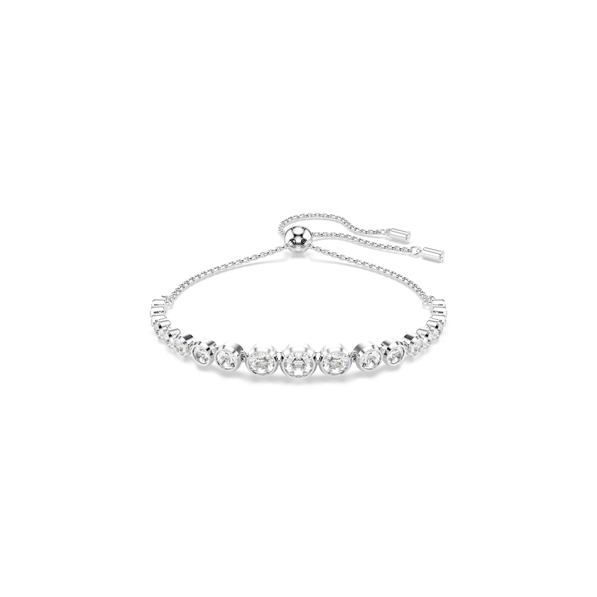 Made for everyday elegance, this rhodium plated bracelet exudes the simplicity of the Imber family. The design features a gradient of clear round-cut crystals, each placed in a modern bezel setting on a soft chain, with a sliding closure for easy wearability. Each delicate drop provides glowing sophistication for your wrist, giving you a go-to piece of jewelry that can be playfully stacked with other styles.