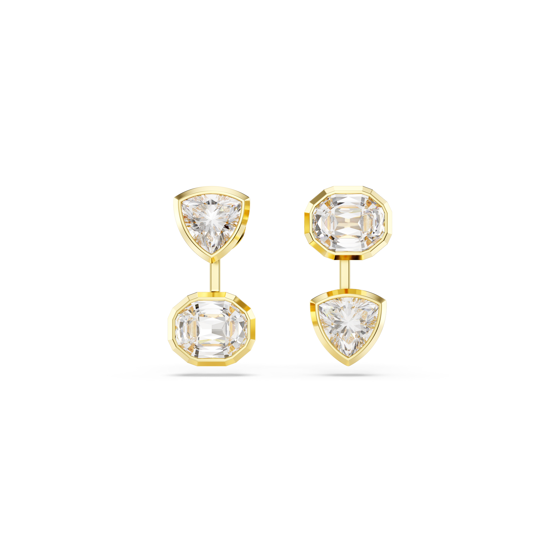 Combining geometry with light, these intriguing statement earrings are gold-tone plated, and feature a pair of trillion- and octagon-cut Swarovski Zirconia on each jacket. The clear stones are placed in a modern bezel setting, and for a dose of asymmetrical style, their position is reversed on either side. Wear these earrings with a matching necklace and let your everyday style shine.
