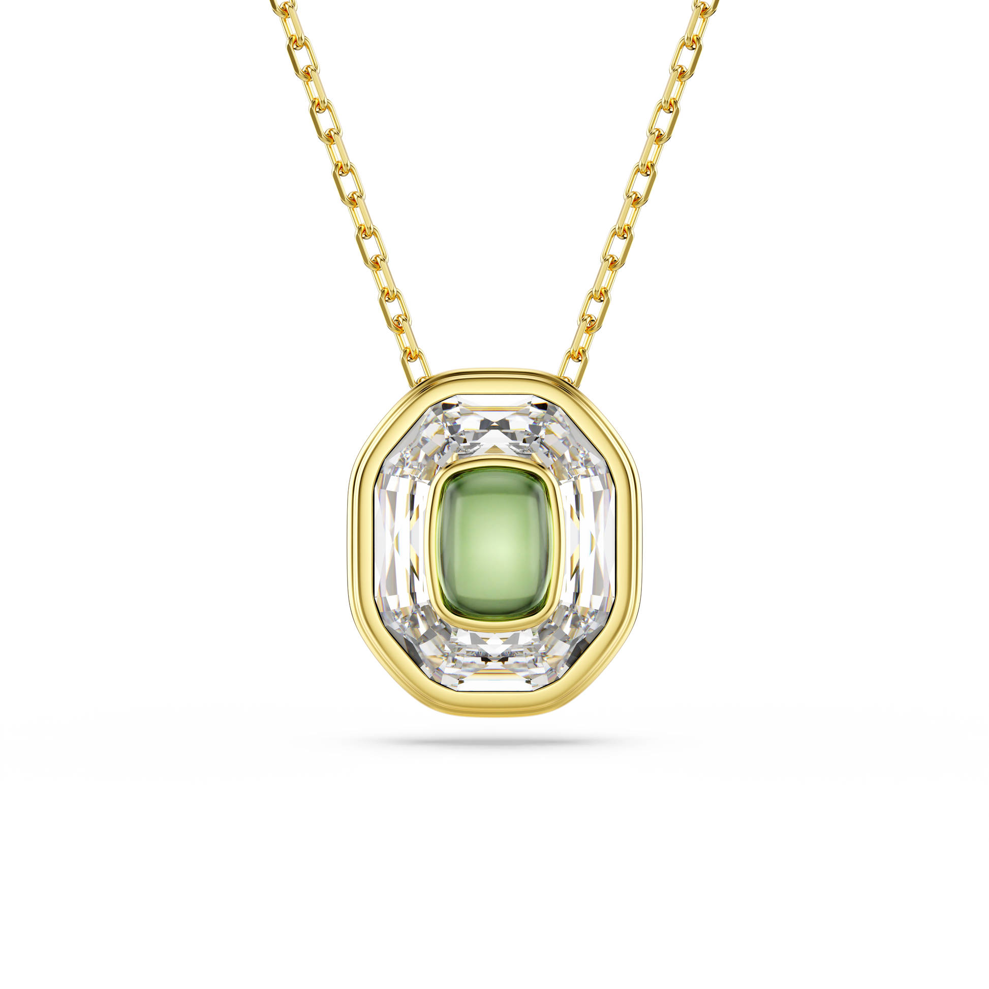 Creativity shines through this expressive Chroma jewelry pendant. Suspended from a delicate chain, the gold-tone plated pendant features a central octagon-shaped motif, with a vibrant green crystal stacked on top of a larger clear crystal. Vivid and full of light, it’s a timeless piece that will always add originality to any outfit.