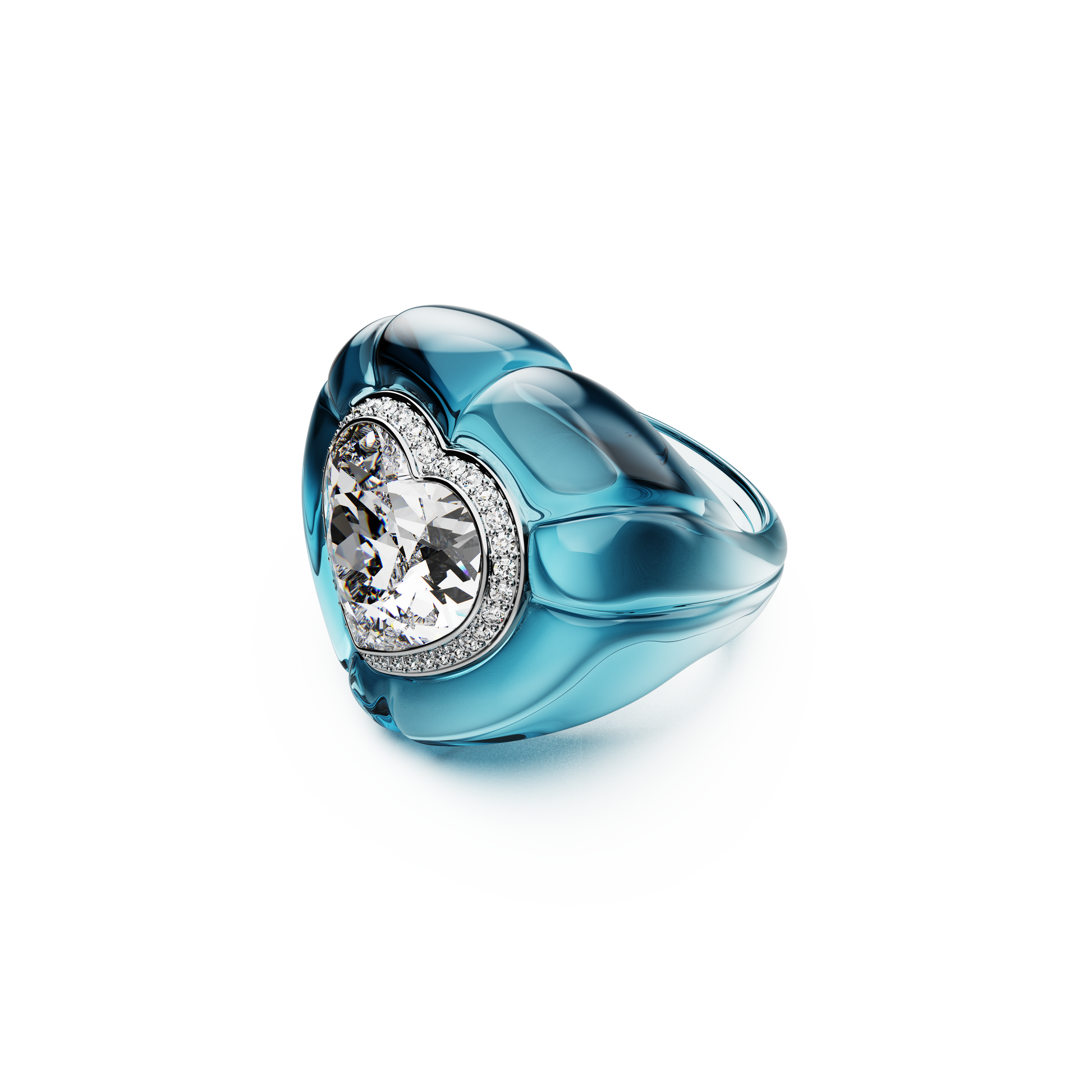 Inspired by the joy of the Pop Art movement, this cocktail ring is a playful way to colorize your style. The heart-shaped blue band is matched by a clear heart-shaped crystal, surrounded by clear pavé in a rhodium plated frame. Wear it any time for a striking bolt of brightness or express your creativity by teaming it with other cocktail rings from the Dulcis family.