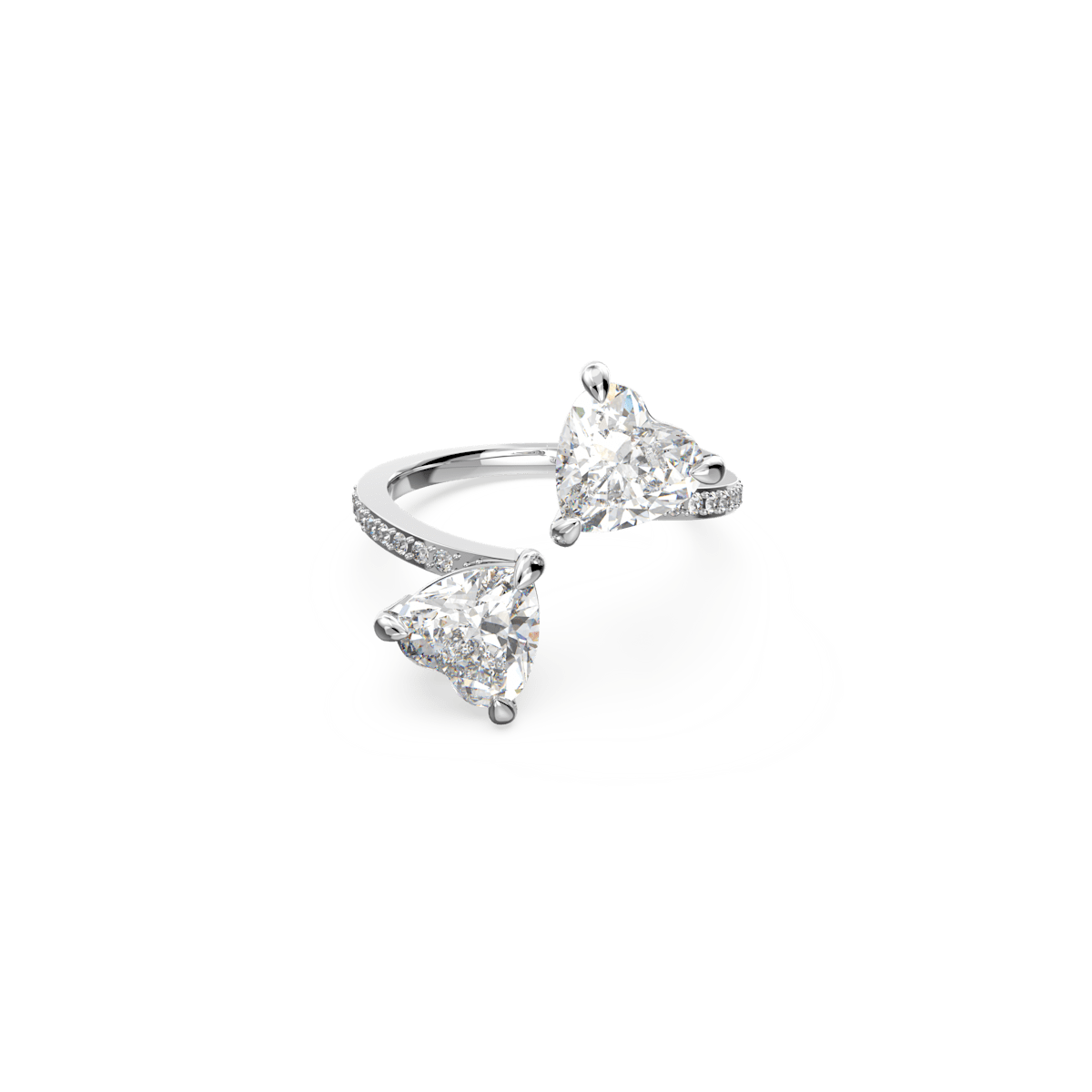 This rhodium-plated Swarovski ring is inspired by the idea of two hearts meeting. It captures the spirit of romance with two heart-shaped, finely cut stones meeting in the middle. The glittering white of the hearts is all the more accentuated by a simple, yet elegant design. Its timeless symbolism makes this Swarovski ring the perfect gift for a special loved one.
