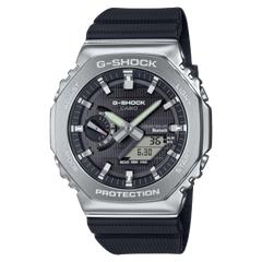 Taking the industry by storm in 2019, the GA2100 series pushed the bounds of design by offering a thin watch with an octagonal bezel and legendary G-SHOCK protection. G-SHOCK then revolutionized the series by adding a stainless-steel bezel, forging the GM2100 series. Always innovating, G-SHOCK then added Bluetooth® connectivity and Tough Solar charging to craft a steel watch beyond compare: the GBM2100 series stainless-steel watch. G-SHOCK G-STEEL combines sophisticated style with peace of mind, crafting steel watches with durable shock resistance and 200-meter water resistance (wr 20 bar). Going the extra mile, G-SHOCK manufactured the watchcase and band from bio-based resin, a material thought to reduce environmental impact. Conscientious at every level, that’s G-SHOCK G-STEEL. Bluetooth® connectivity ensures your GBM2100-1A is always accurate, as this stainless-steel watch automatically updates the time from your smartphone. With auto summer switching for Daylight Savings Time, the sophistication of a stainless-steel G-SHOCK is combined with easy operation, making the sophistication a hands-free experience. Add in the Tough Solar charging, and you have a watch that’s not only tough but reliable for years. The GBM2100-1A maximizes comfort, style, and ease of use. Traveling is also made easier with the GBM2100-1A. World Time allows you to view the time in 38 time zones, and the Casio Watches app makes it a cinch to switch between your Home Time City and your World Time City. Swap between your World Time City and your Home Time City quickly and easily as soon as you reach your destination.