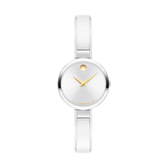 The Moda is defined by a slim, jewelry-inspired bracelet and our iconic Museum Dial. This 24mm watch features a silver white sunray dial, yellow gold tone dauphine hands, and a bangle bracelet.