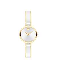 The Moda is defined by a slim, jewelry-inspired bracelet and our iconic Museum Dial. This 24mm watch features a silver white sunray dial, yellow gold tone dauphine hands, and a bangle bracelet.