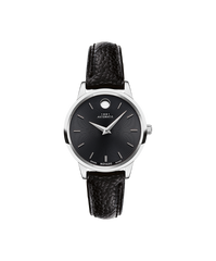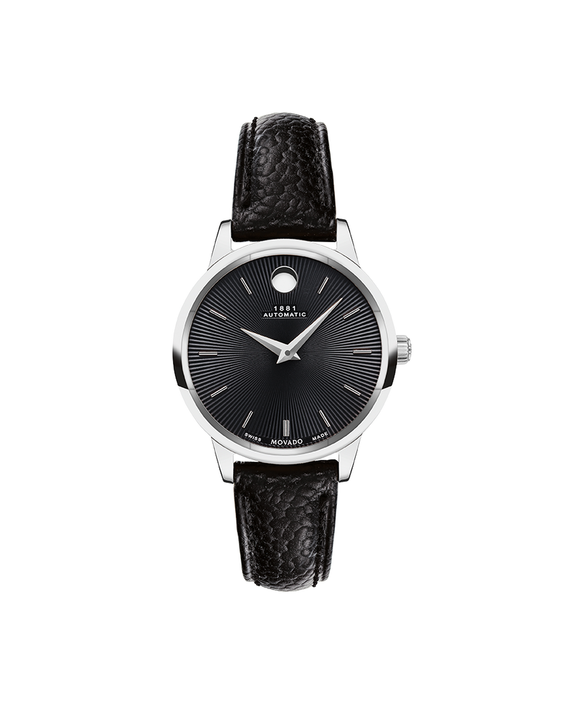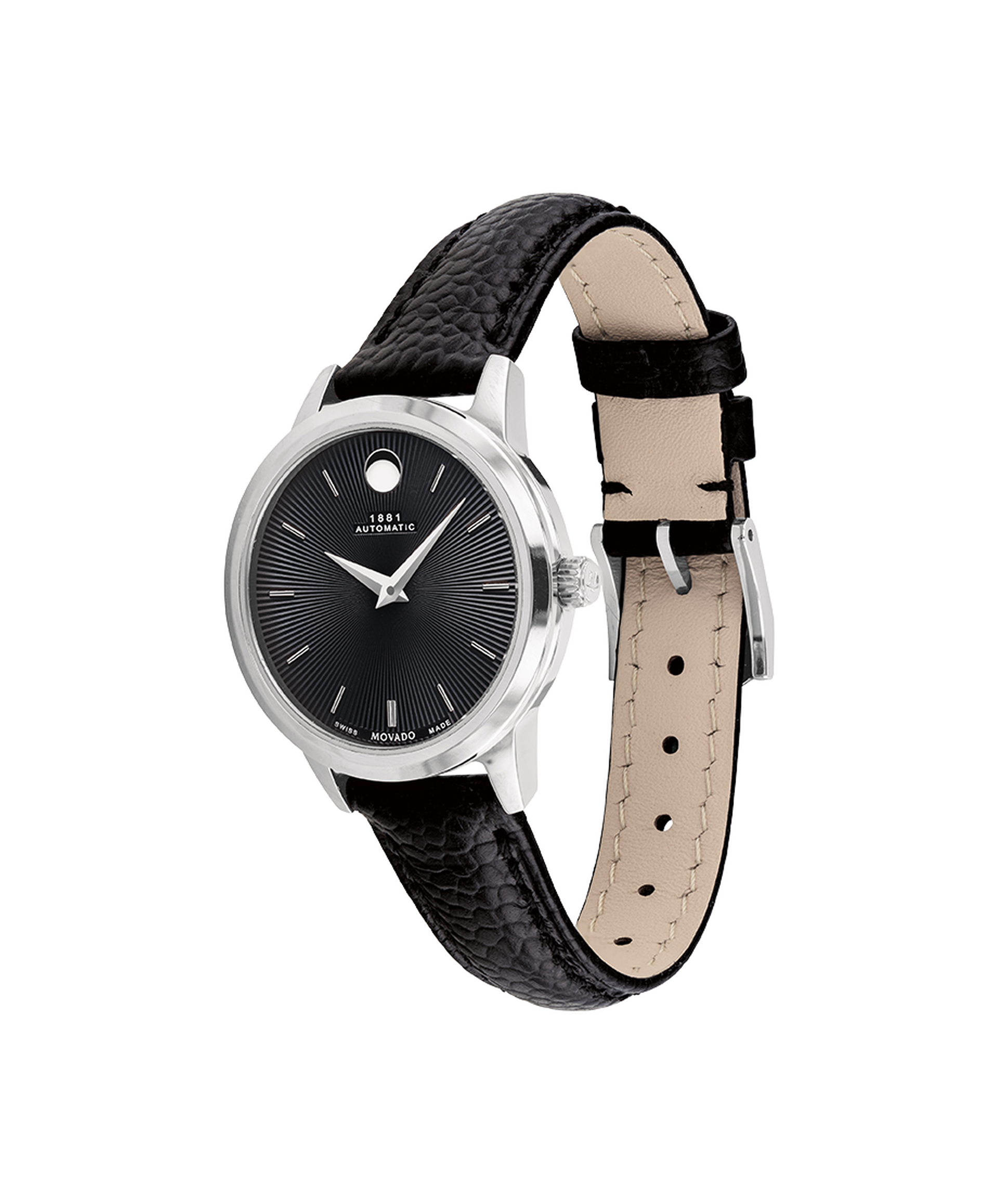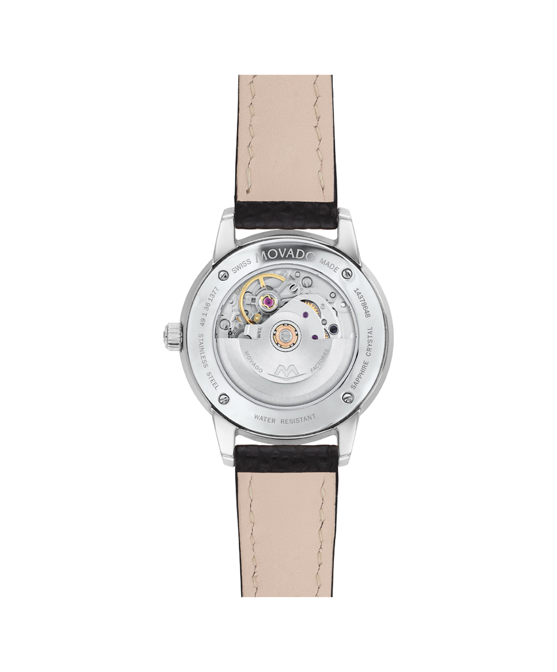Movado 1881 Automatic, 30 mm stainless steel case with black textured dial and black calfskin leather strap. Caseback features an exposed automatic movement. Automatic watches do not contain batteries. They are charged by the movement of your wrist.