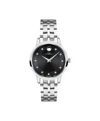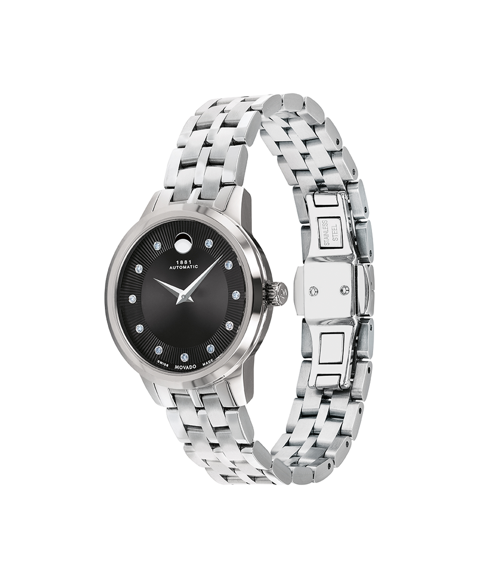 Movado 1881 Automatic, 30 mm stainless steel case and bracelet with black textured dial & 11 Diamond Markers. Caseback features an exposed automatic movement. Automatic watches do not contain batteries. They are charged by the movement of your wrist.