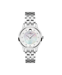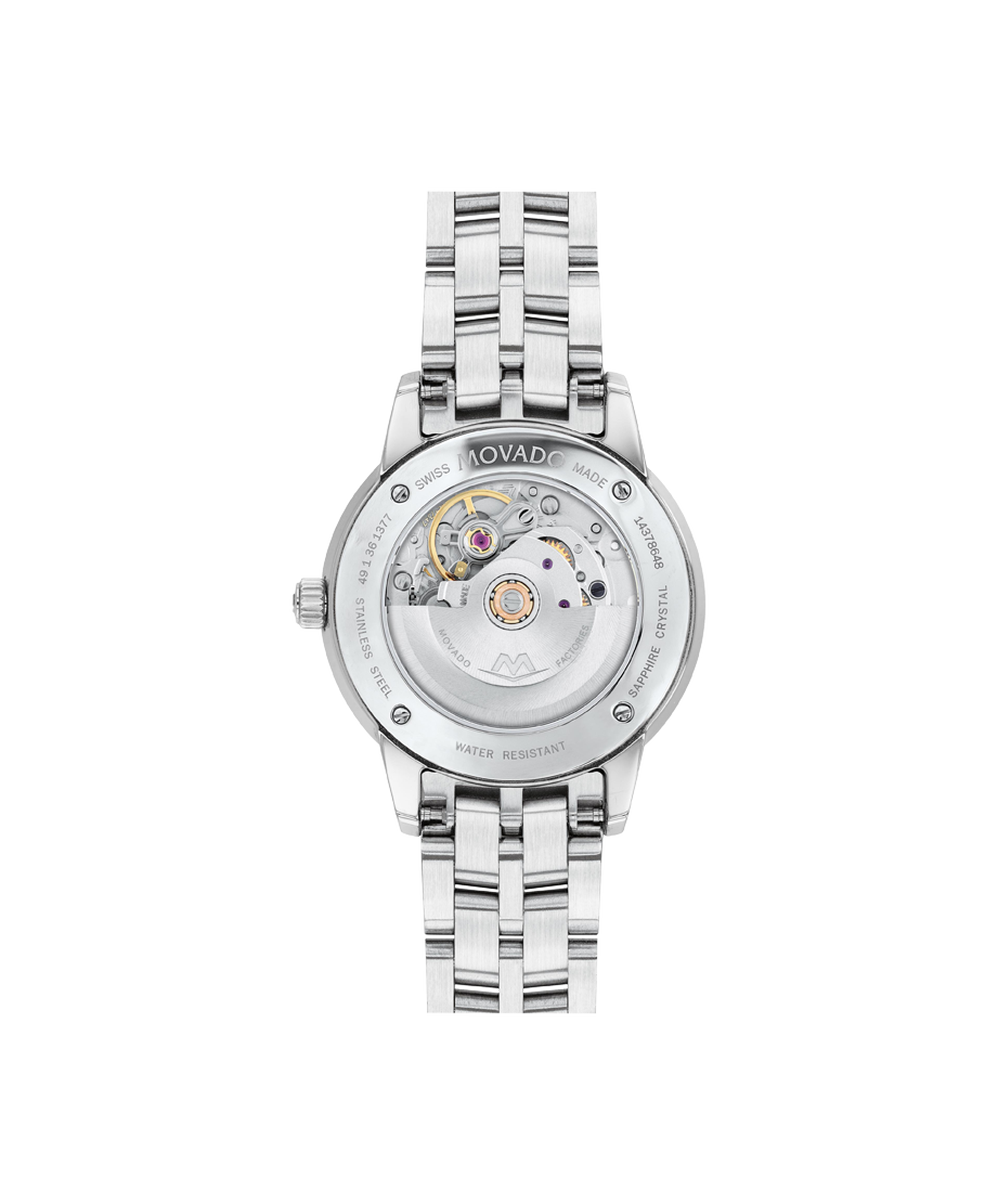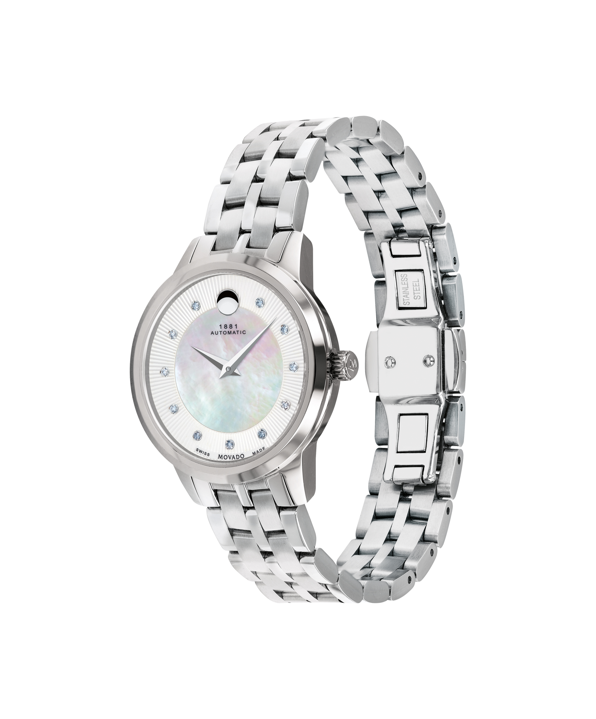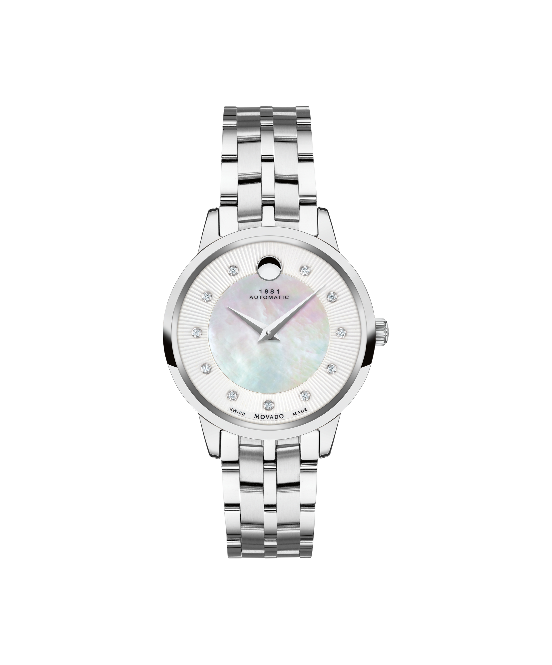 Movado 1881 Automatic, 30 mm stainless steel case and bracelet with white mother-of-pearl textured dial & 11 Diamond markers. Caseback features an exposed automatic movement. Automatic watches do not contain batteries. They are charged by the movement of your wrist.