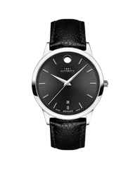Movado 1881 Automatic, 40mm stainless steel case with black textured dial and black calfskin leather strap. Caseback features an Exposed Automatic Movement. Automatic watches do not contain batteries. They are charged by the movement of your wrist.