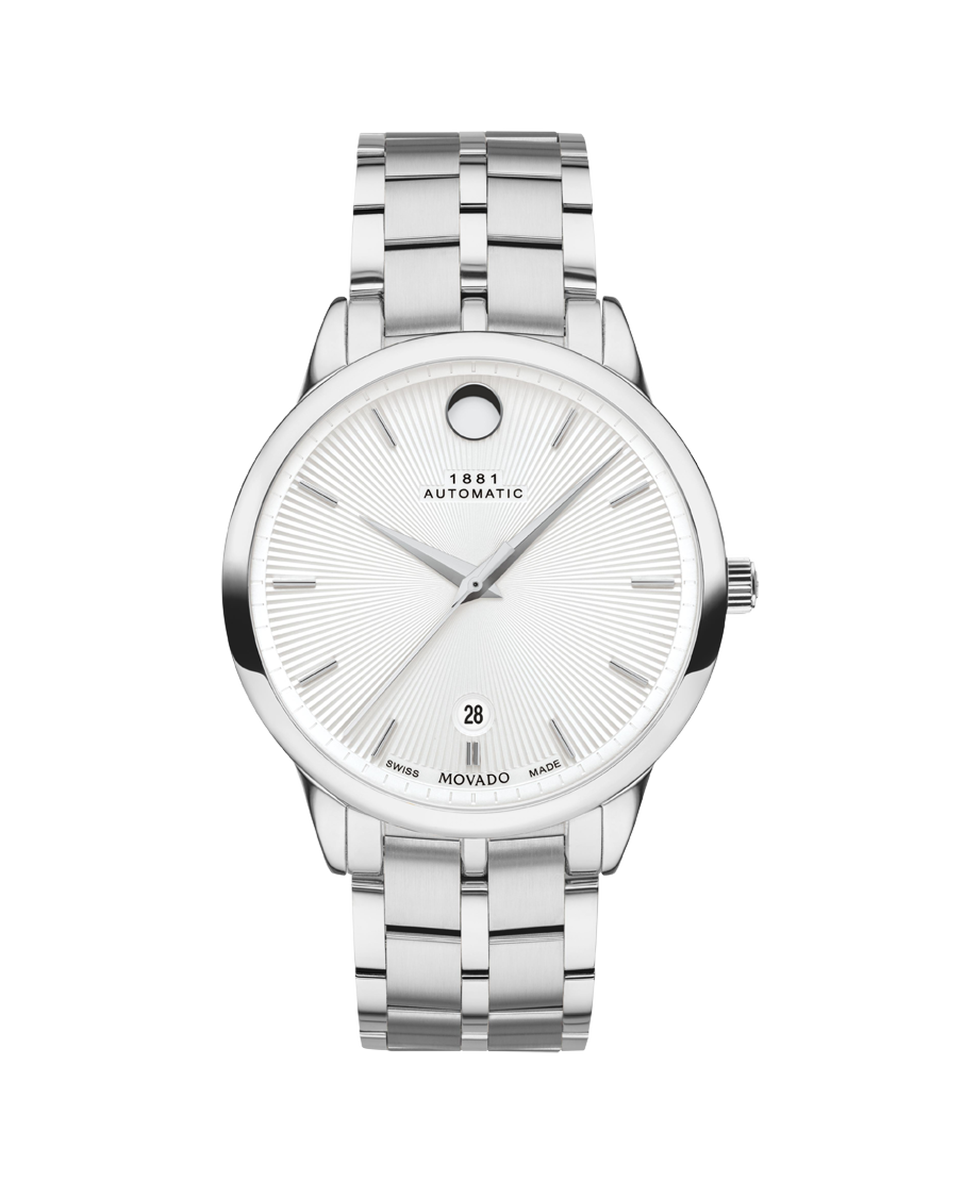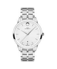 Movado 1881 Automatic, 40mm stainless steel case and bracelet with silver white textured dial. Caseback features an exposed automatic movement. Automatic watches do not contain batteries. They are charged by the movement of your wrist. If the watch is not worn it will stop running in about 38 hours.