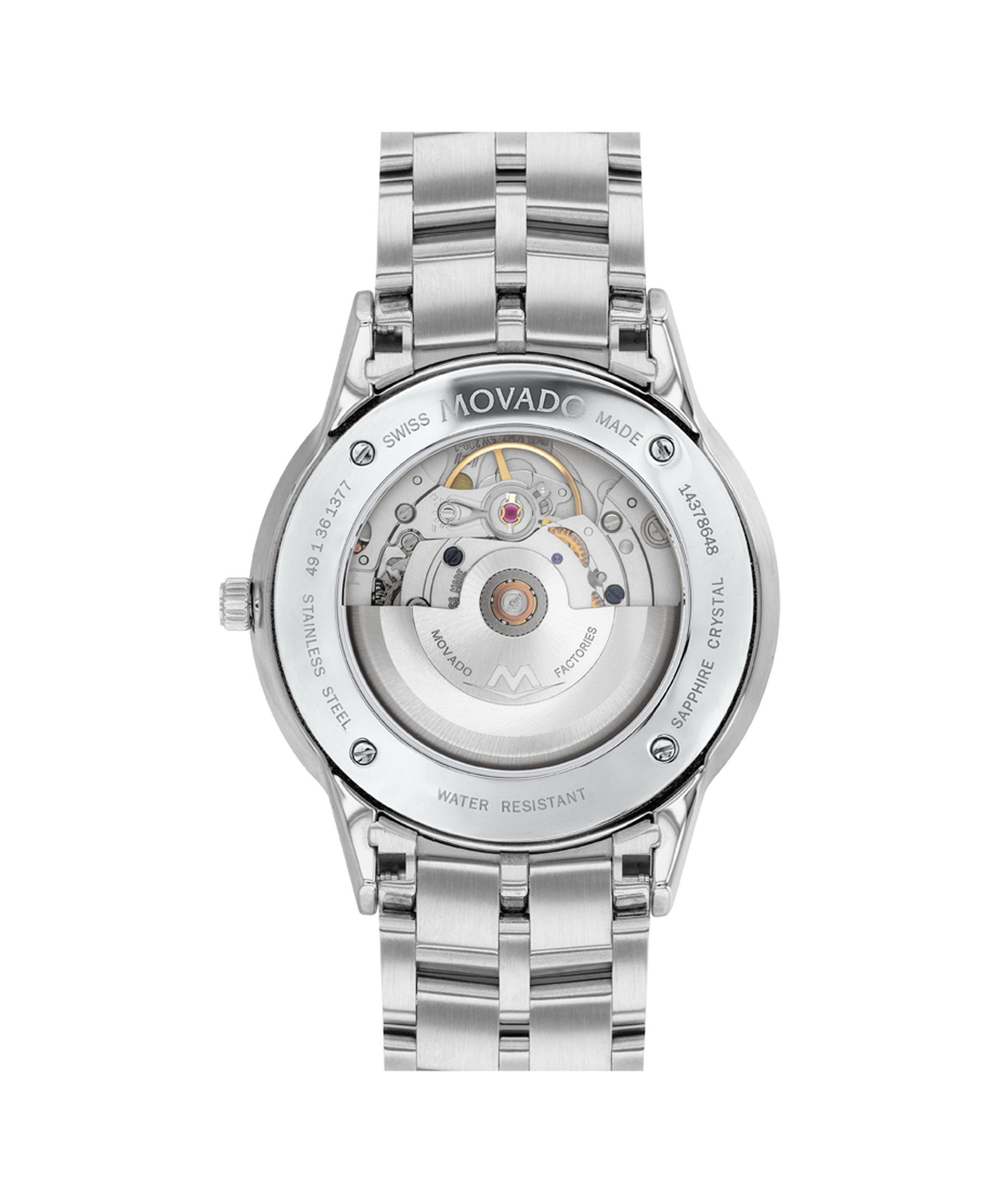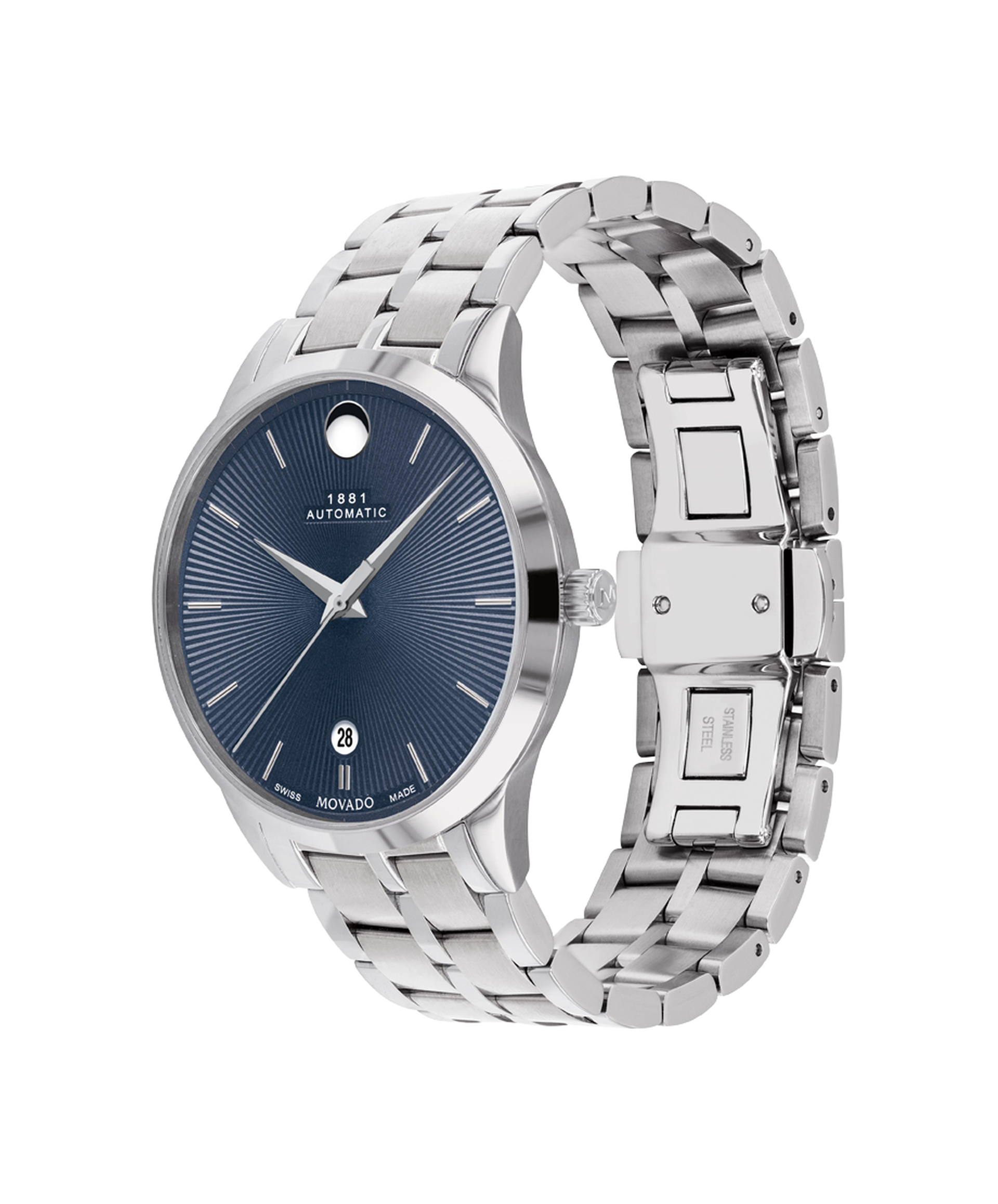Movado 1881 Automatic, 40mm stainless steel case and bracelet with blue textured dial. Caseback features an exposed automatic movement. Automatic watches do not contain batteries. They are charged by the movement of your wrist. If the watch is not worn it will stop running in about 38 hours.