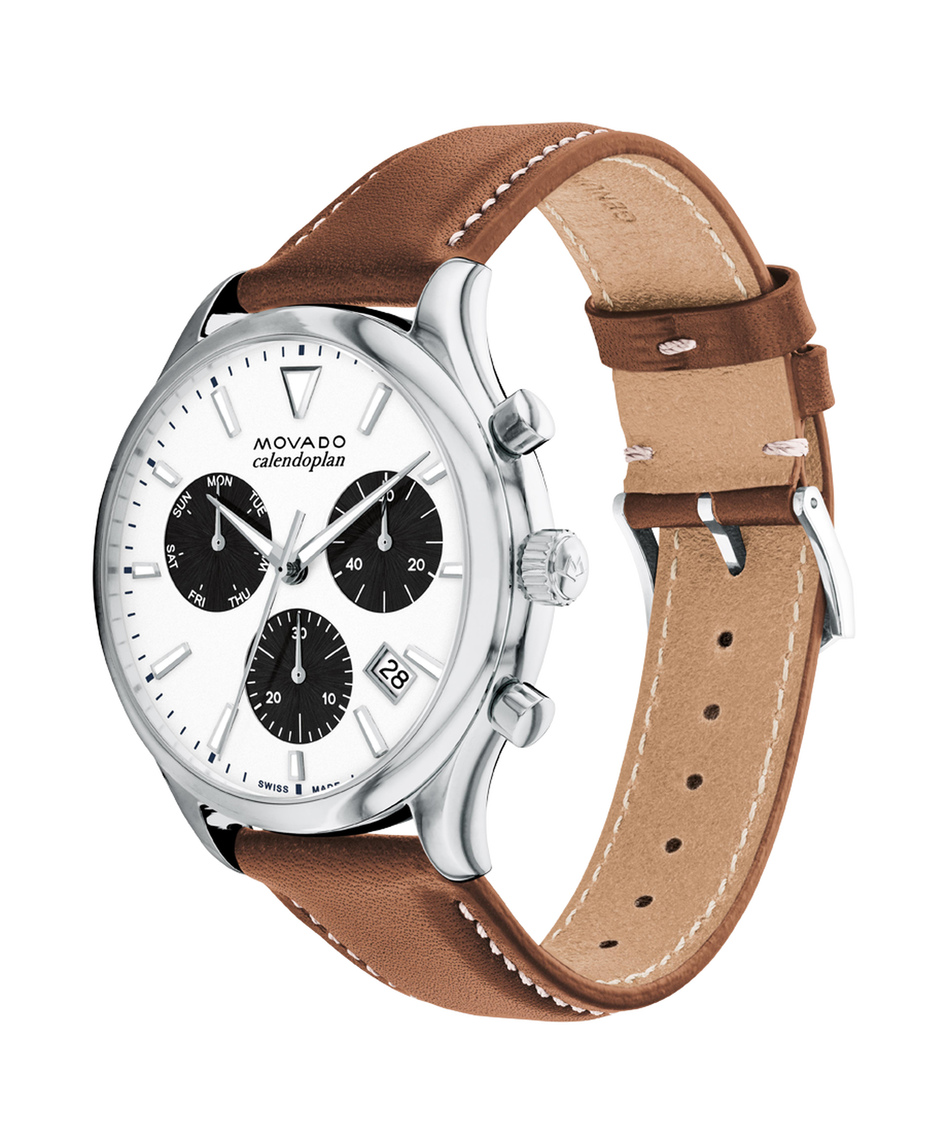 First introduced in 1950, the Movado Calendoplan captures the soul of mid-century design with contemporary details. This timeless chronograph timepiece is inspired by our archives and features a 43mm stainless steel case framing a white dial outfitted with three black subdials, Swiss Super-LumiNova® accents and a date window.