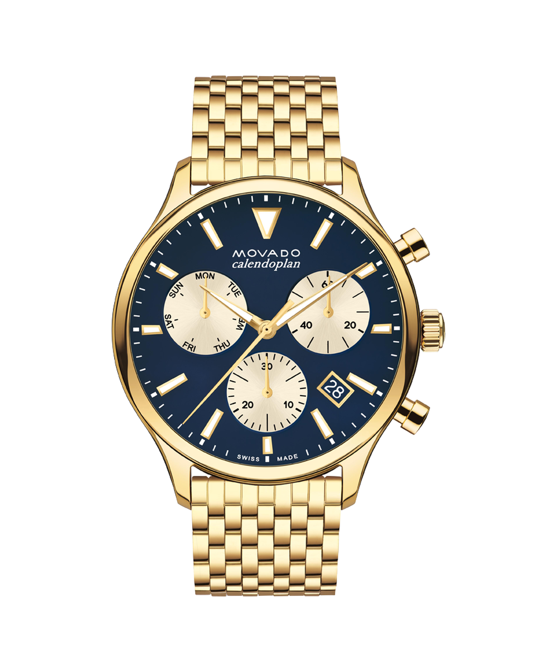 The Heritage Series Calendoplan takes a modern approach to a classic 1950's silhouette. This 43mm chronograph features a navy dial, Swiss Super-LumiNova accents, and a date window.