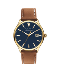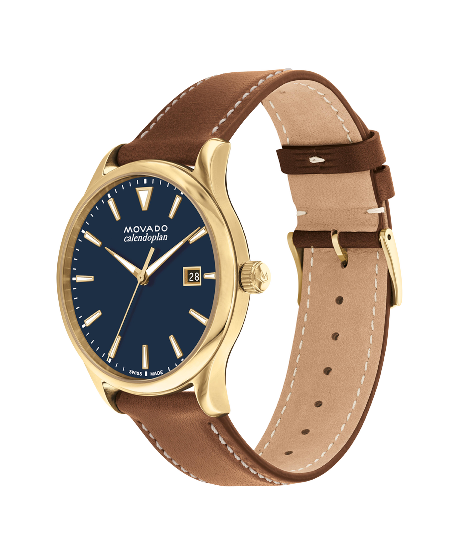 First introduced in 1950, the Movado Calendoplan captures the soul of mid-century design with contemporary details. This timeless design is inspired by our archives and features a 40mm case of rich yellow gold ion-plated stainless steel framing a deep blue dial outfitted with Swiss Super-LumiNova® accents and a date window.