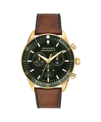 Movado Heritage Series Calendoplan S Chronograph, 42mm yellow gold-ion plated case with fluidly extended lugs, green aluminum bezel & green chronograph dial. Features Swiss Super-LumiNova® accents on cognac leather strap.