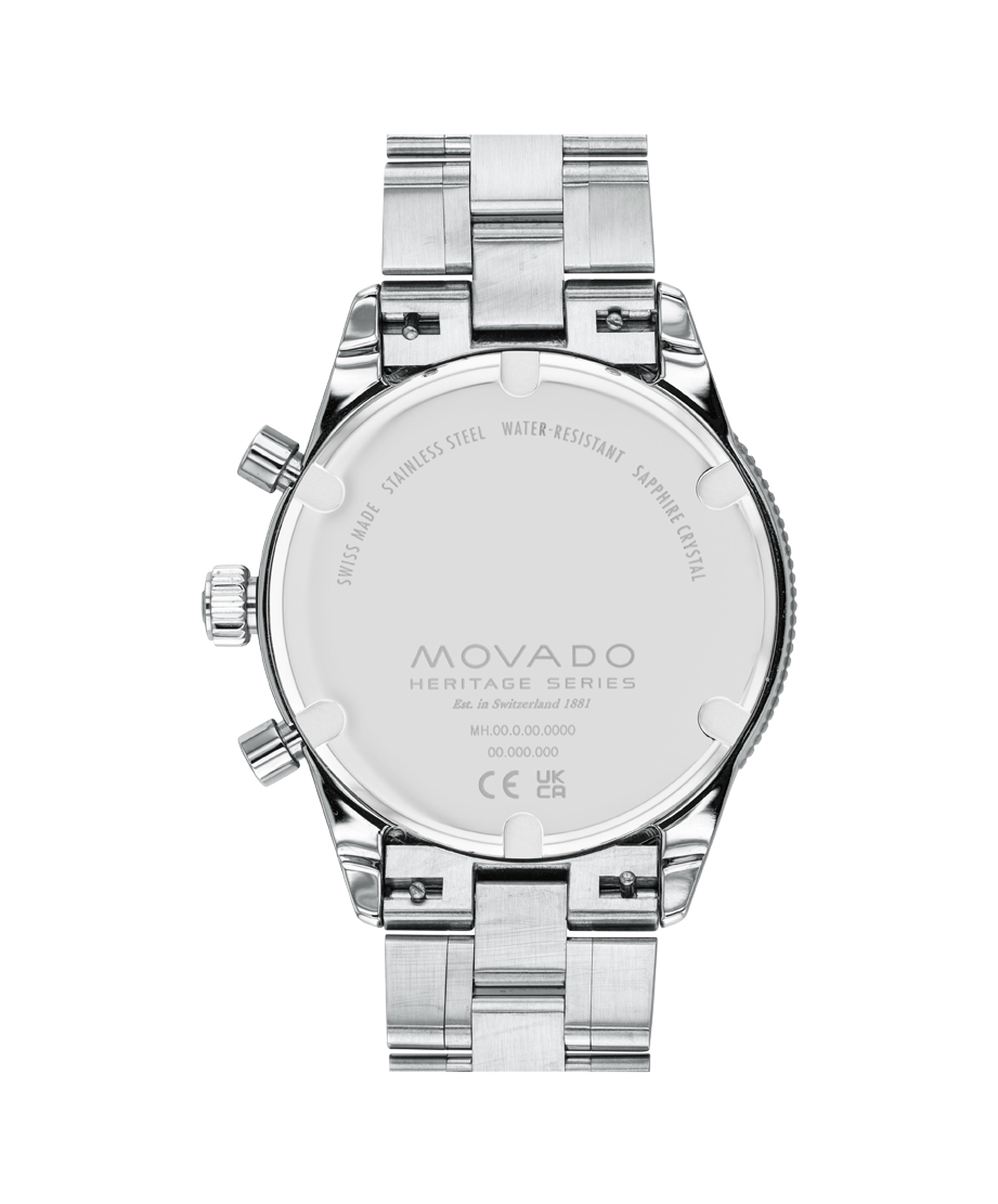 Movado Heritage Series Calendoplan Chronograph, 42 mm stainless steel case and bracelet with blue-toned dial & unidirectional rotating bezel.