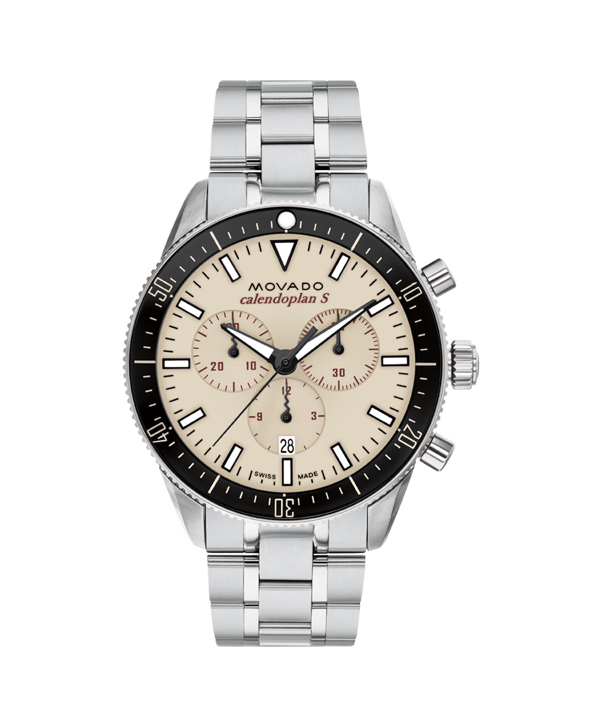 The Heritage Series Calendoplan S modernizes our classic 1950's silhouette with a sporty edge. This 42mm chronograph watch features a sand dial, Swiss Super-LumiNova accents, and a black aluminum bezel.
