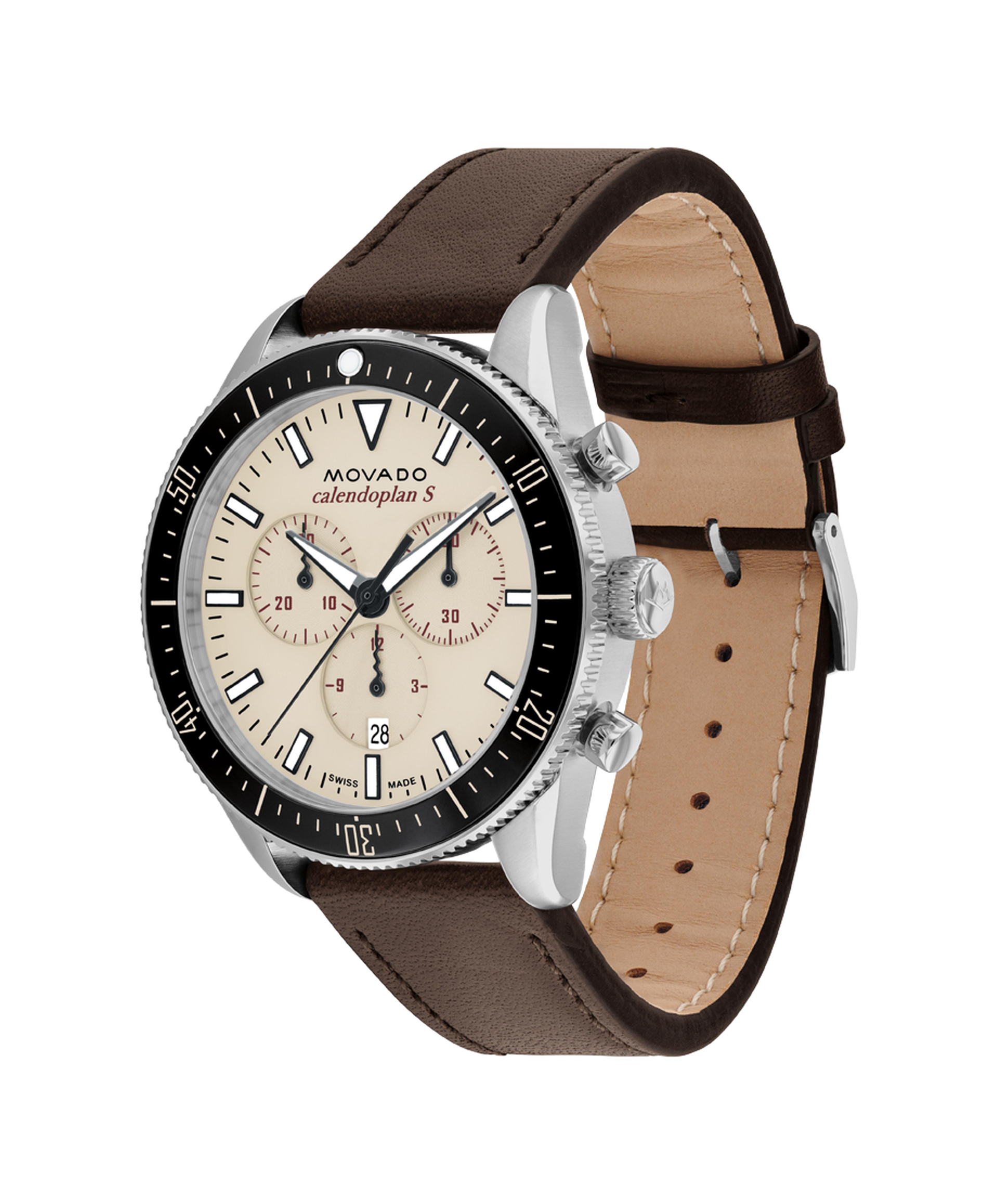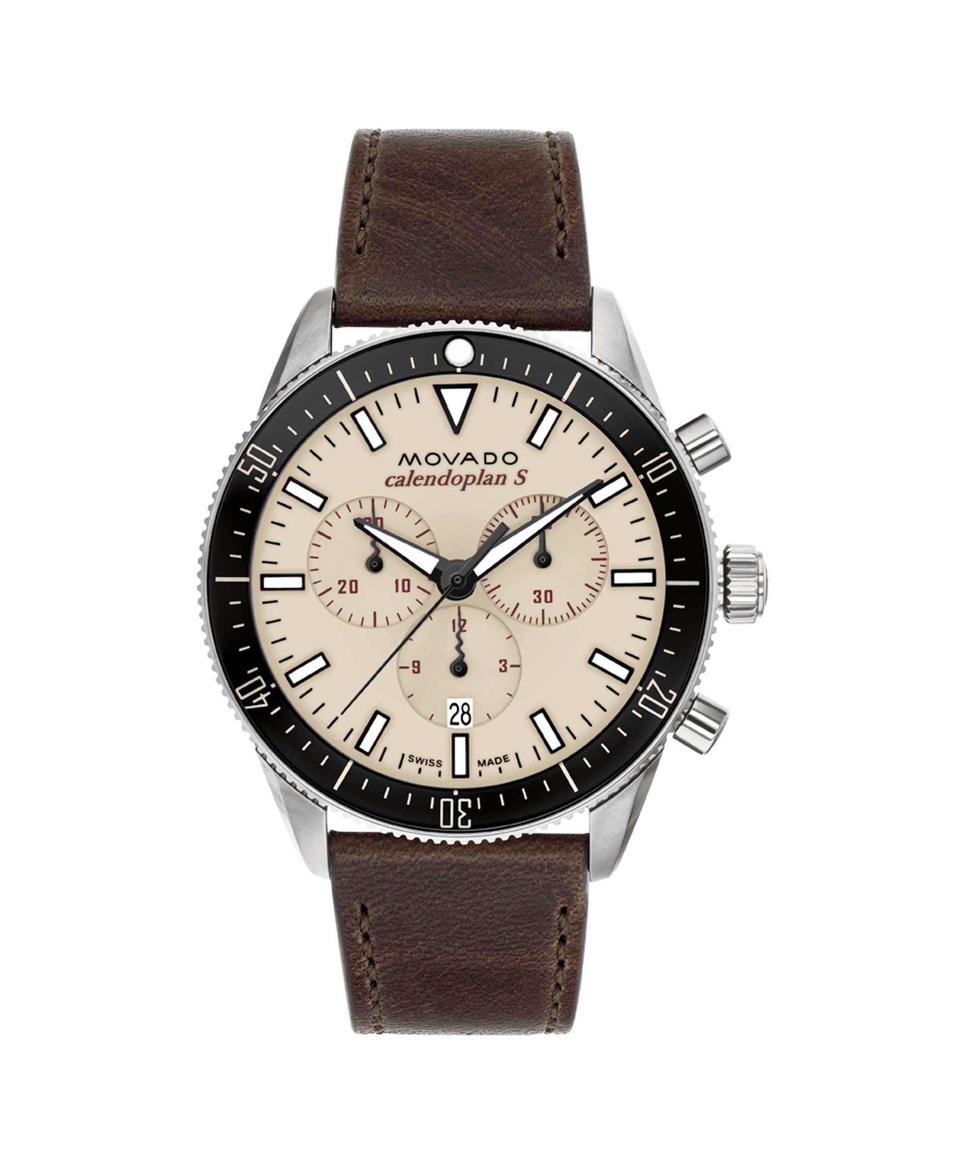The Heritage Series Calendoplan S modernizes our classic 1950's silhouette with a sporty edge. This 42mm chronograph watch features a sand dial, Swiss Super-LumiNova accents, and a black aluminum bezel.