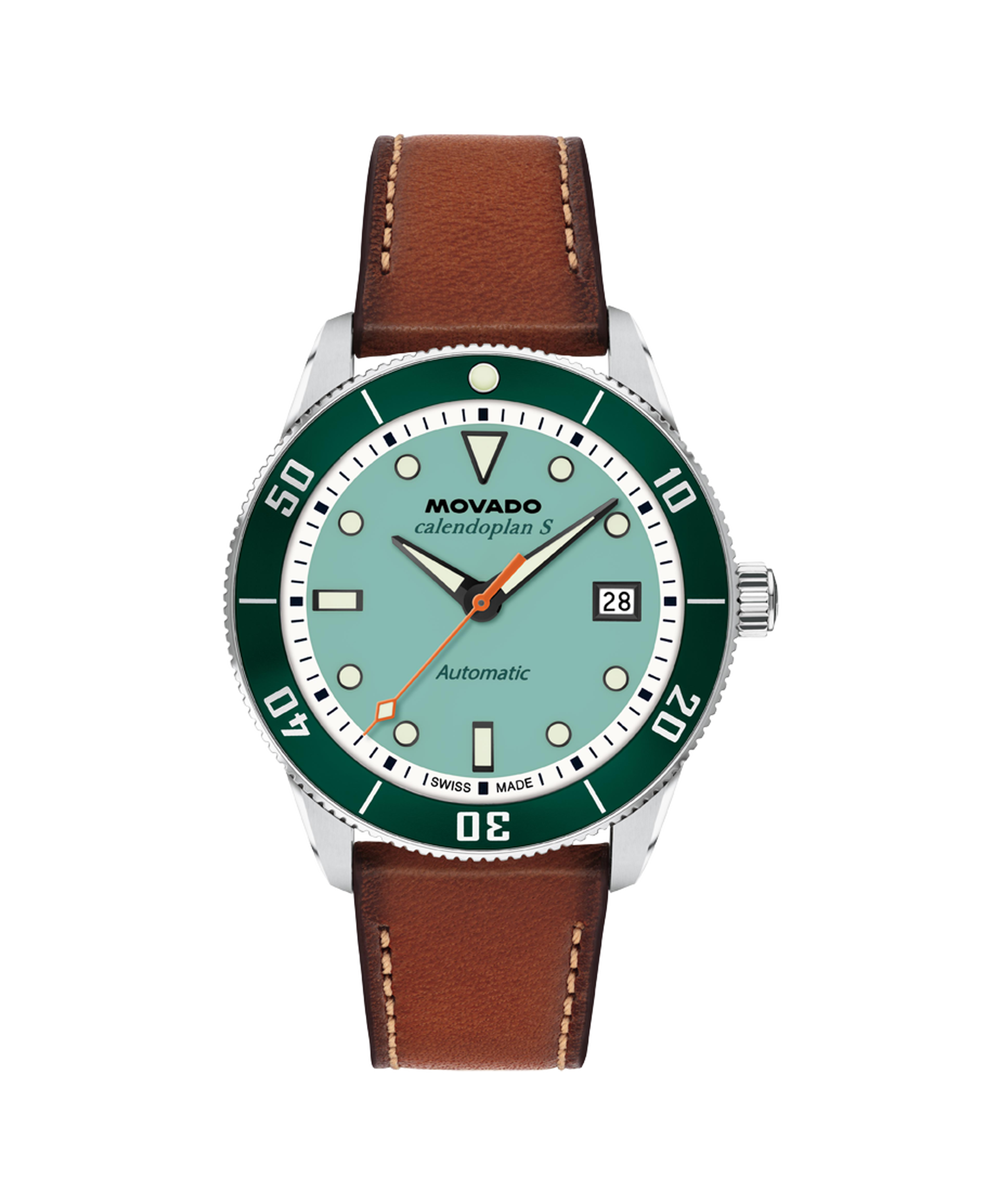 The Heritage Series Calendoplan S modernizes our classic 1950's silhouette with a sports edge. A Swiss made self-winding movement drives this watch, powered by the motion of your wrist. This 40mm watch features an aqua lacquer dial, Swiss Super-LumiNova accents, and a green aluminum bezel.