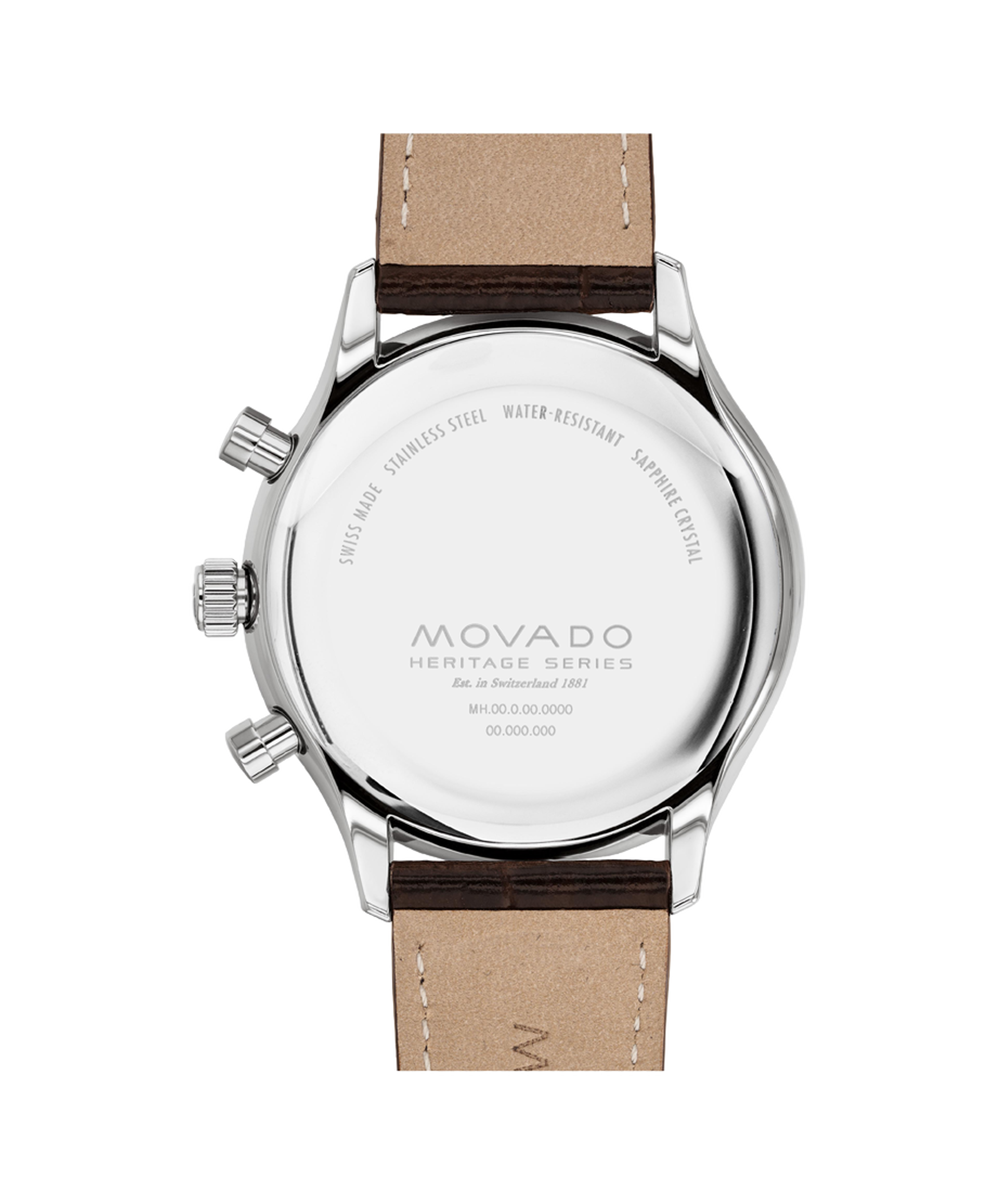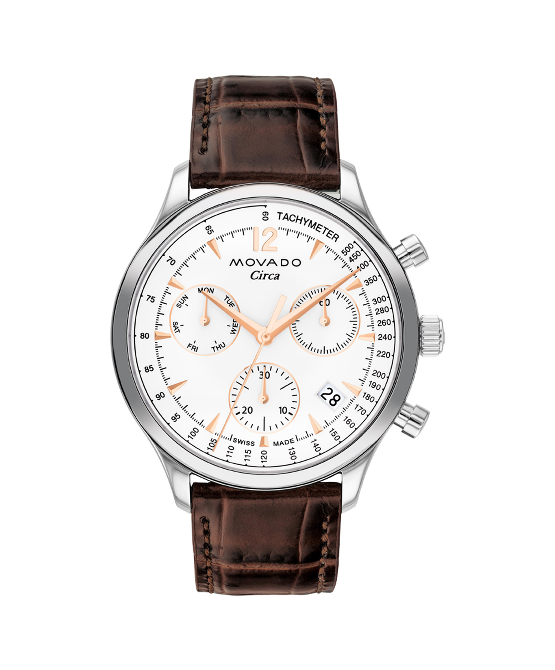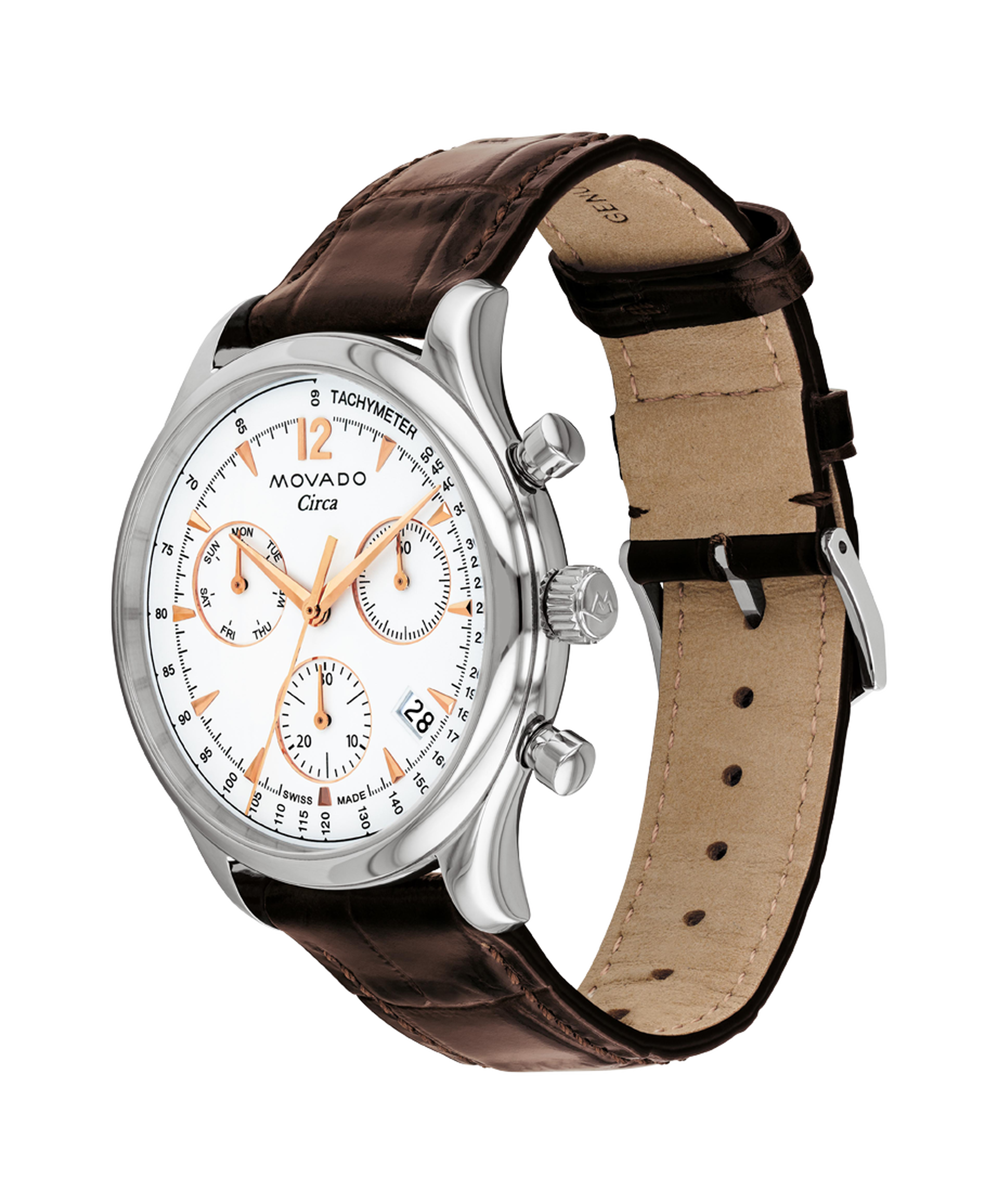 Movado Heritage Series Circa, 43 mm stainless steel case with white chronograph dial on brown faux crocodile leather strap.