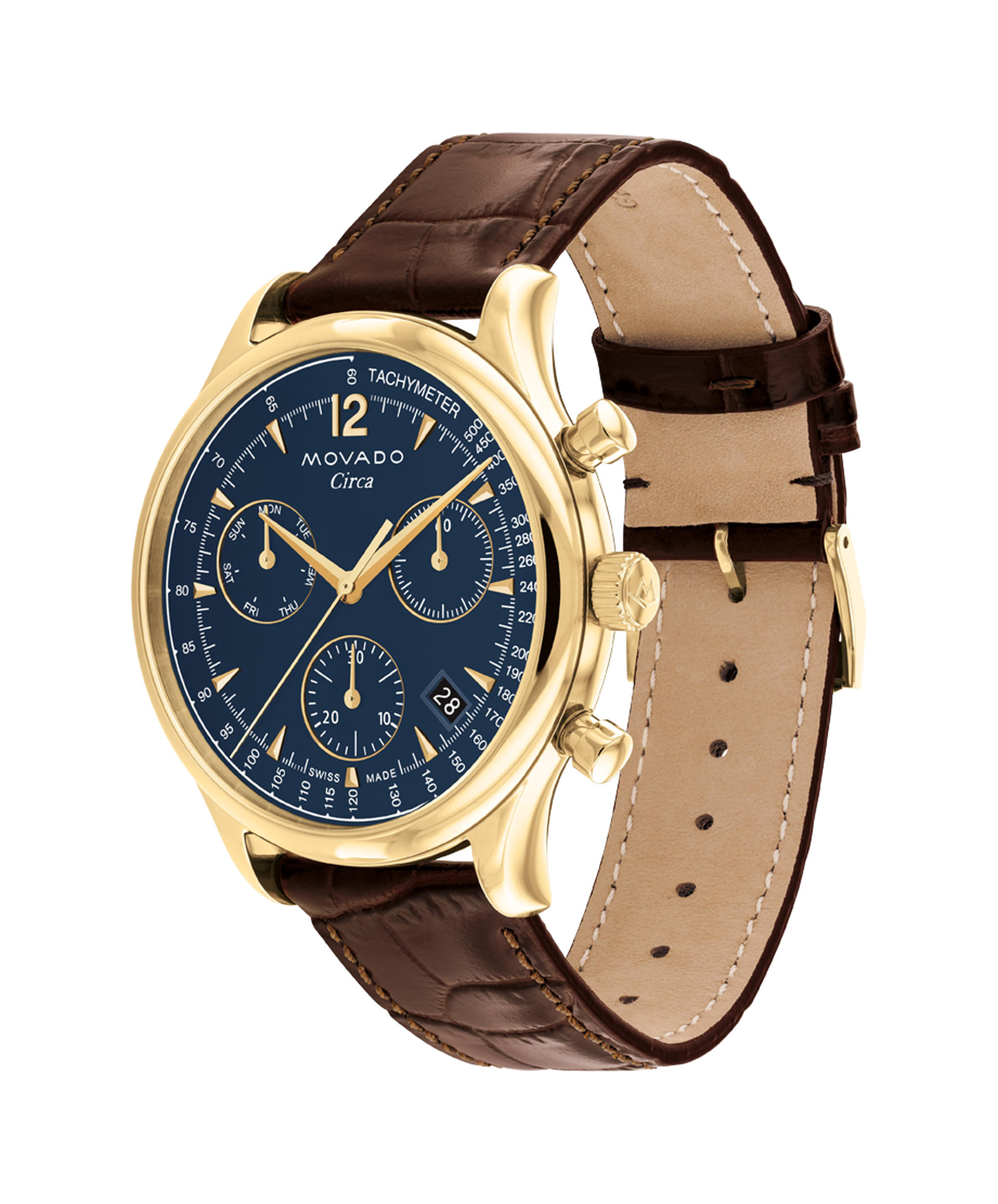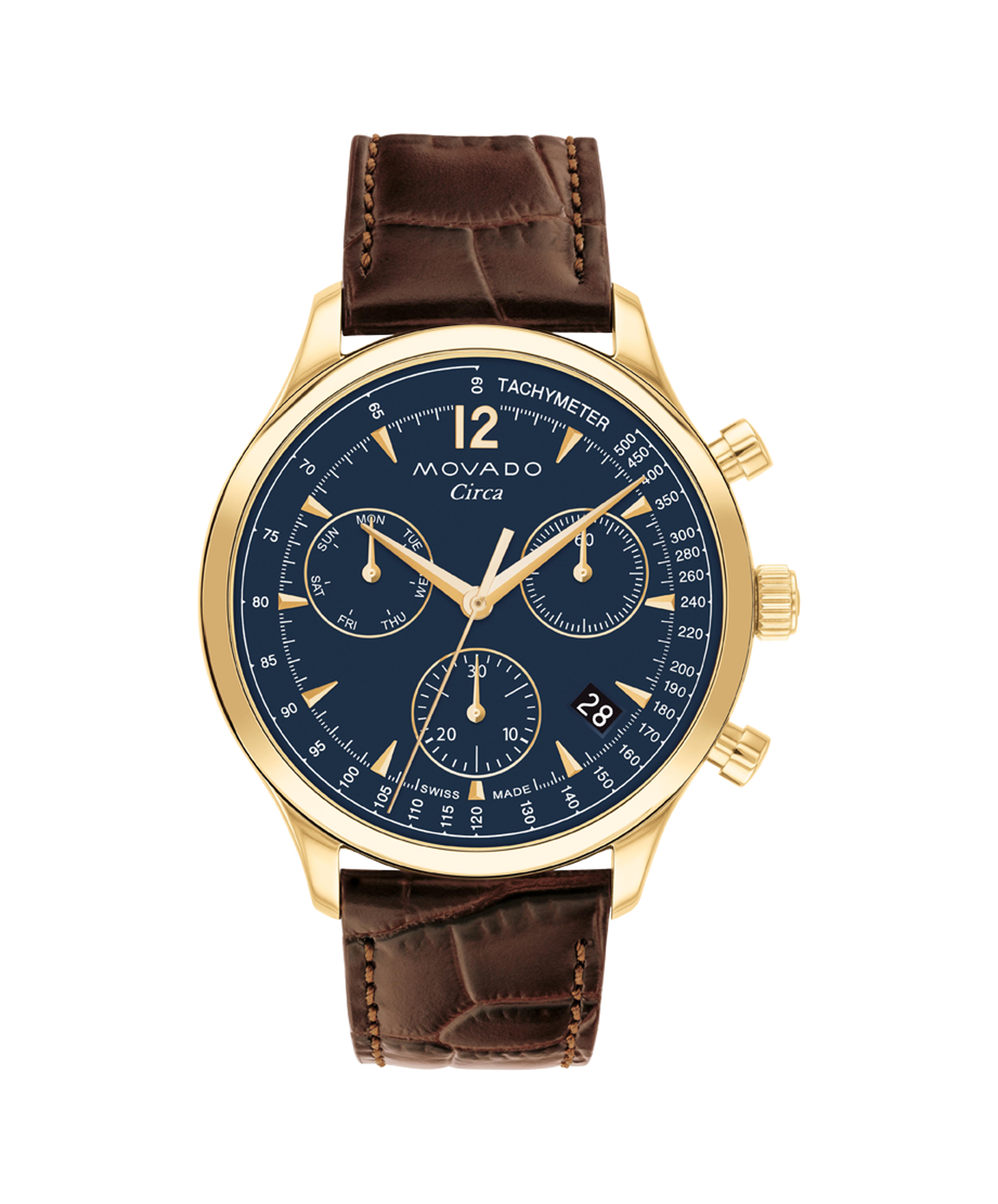 The Heritage Series Circa pairs technical function with classic mid-century design. This 43mm chronograph watch features a deep blue dial, tachymeter scale, and yellow goldtone dauphine hands.