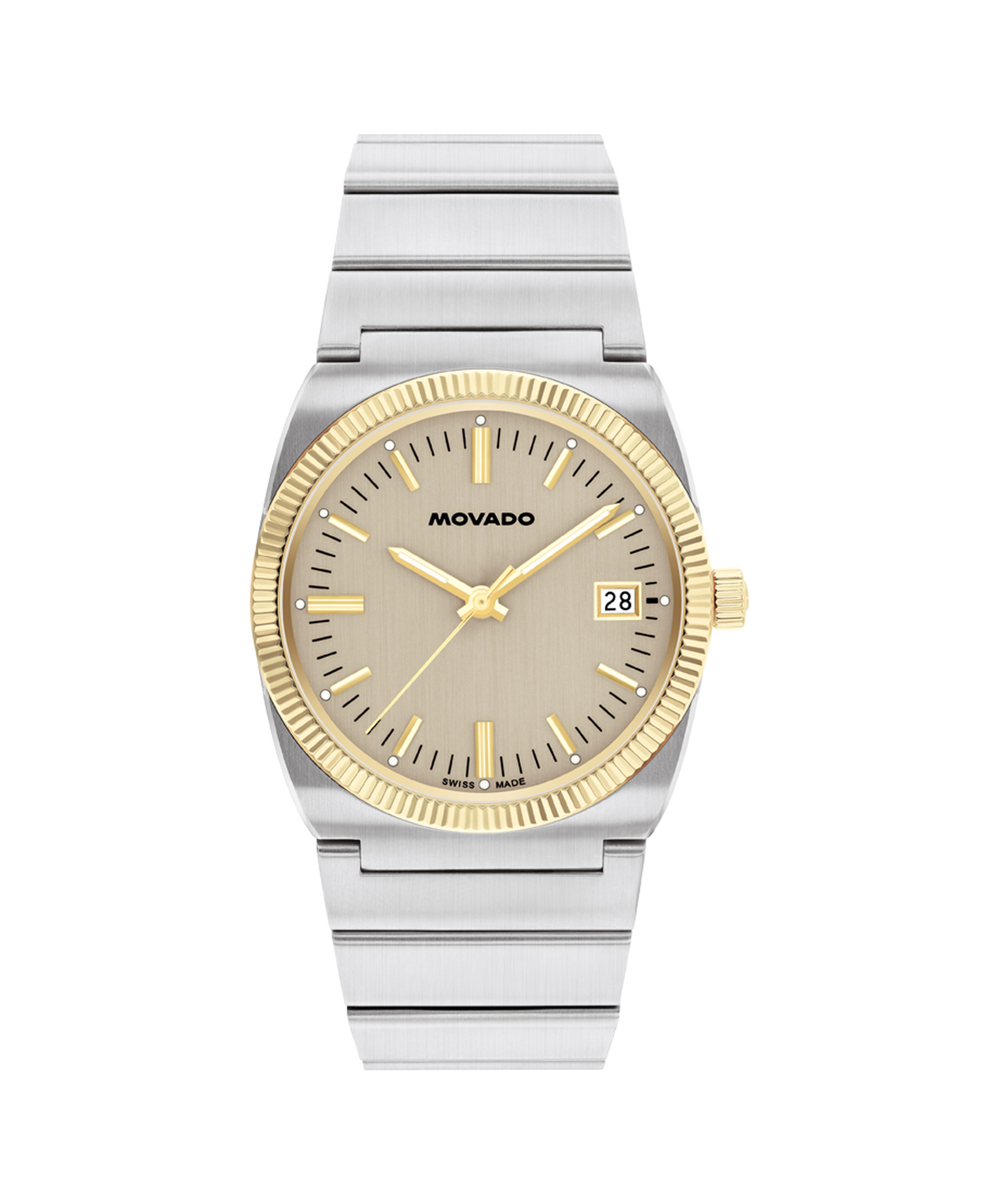 The Heritage Series Ondoplan echoes the distinctive styling of our 1970s Electronic Surf Series, highlighted by a wave-inspired fluted bezel and integrated bracelet. This 36mm watch features a warm grey dial, fluted bezel, and yellow gold-tone hands.